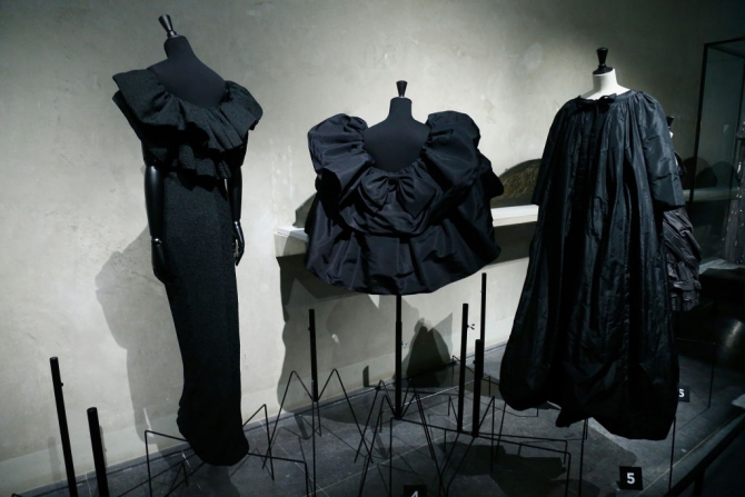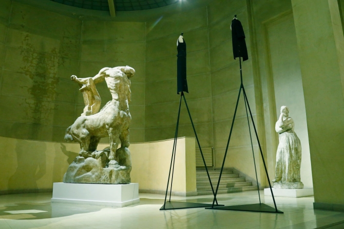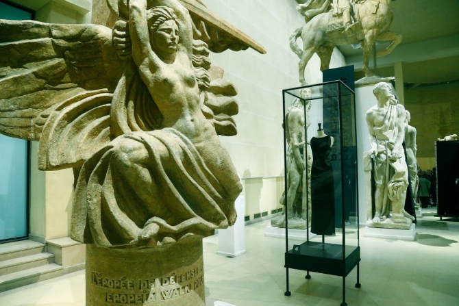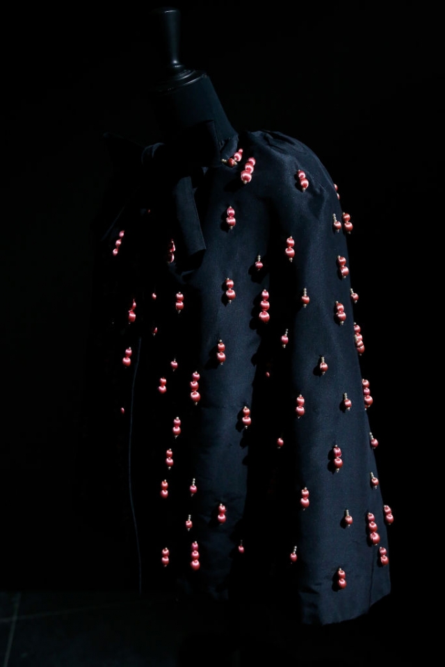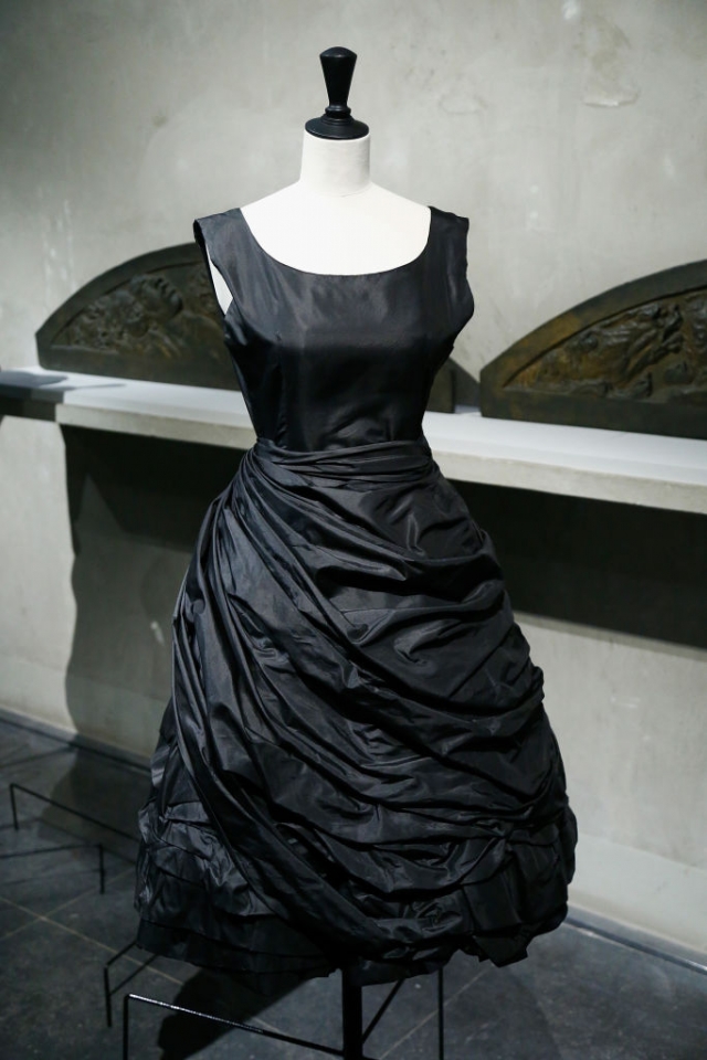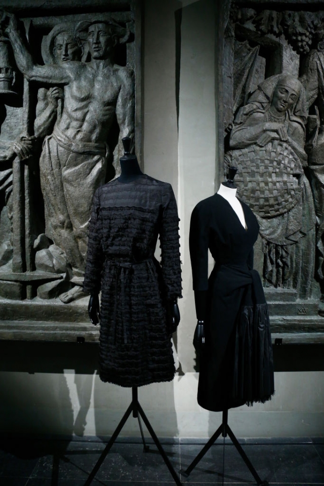 Выставка собрана исключительно из черных платьев и других предметов одежды из архивных коллекций Balenciaga. Кураторы удачно выбрали площадку для проведения выставки, разместив кутюрные вещи среди произведений античного и древнего искусства в залах Музея Бурделя.