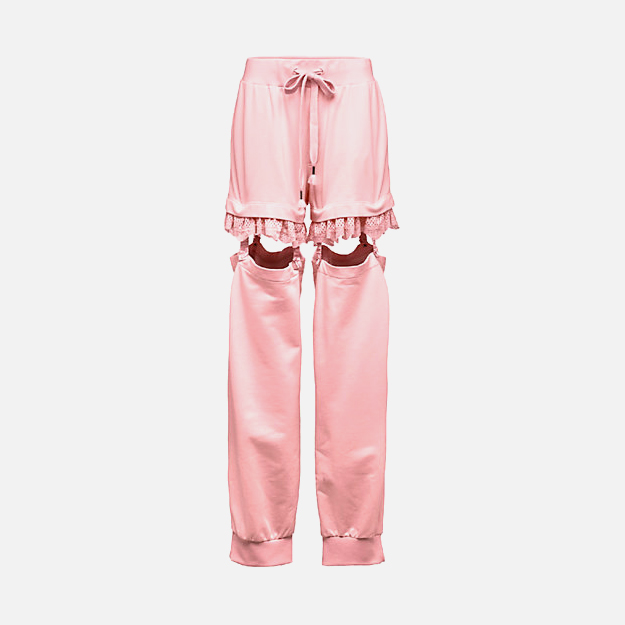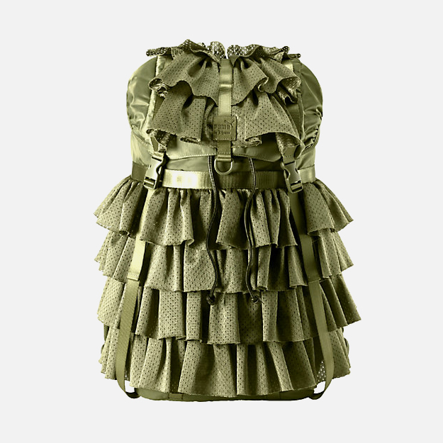 В коллекции можно найти корсеты в сочетании с тренировочными штанами и кедами на платформе, чокеры с лентами, бомберы с перфорацией. Основными декоративными элементами выбраны воланы и шнуровка.