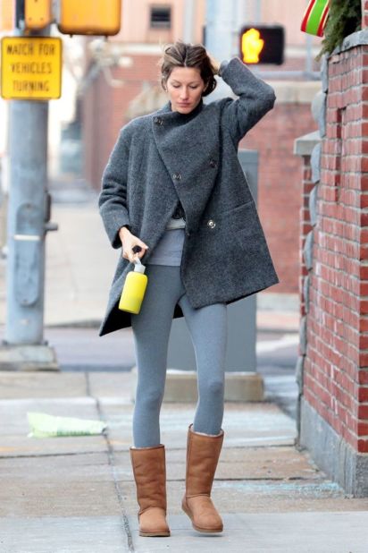 Самая популярная комбинация, особенно любимая моделями вроде Жизель Бюндхен и Джиджи Хадид — это UGG и легинсы. В таком комплекте можно отправляться на беззаботные зимние прогулки и воскресные бранчи с подругами, накинув хоть строгое пальто, хоть лаконичный пуховик. Также ботинки UGG легко представить с прямыми джинсами — один из таких уютных образов Сары Джессики Паркер не выходит у нас из головы. Особенно очаровательно ботинки из овчины будут смотреться на контрасте с платьем: выбирайте модели средней длины и плотной фактуры — например, из трикотажа.