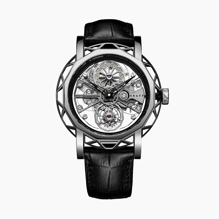 Главной новинкой от ювелиров из Graff стала модель MasterGraff Floral Tourbillon, ее циферблат усыпан узорами из белого золота, декор выполнялся вручную.