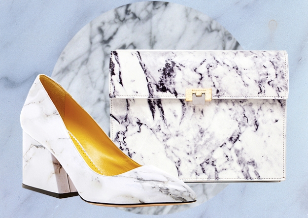 Принт с узнаваемым рисунком этого камня — тонкие черные прожилки на белом фоне — в этом сезоне встречается повсеместно. Главным образом на аксессуарах: клатчах, ботинках, туфлях-лодочках и даже украшениях, например, кольцах, серьгах-шандельерах и массивных браслетах.