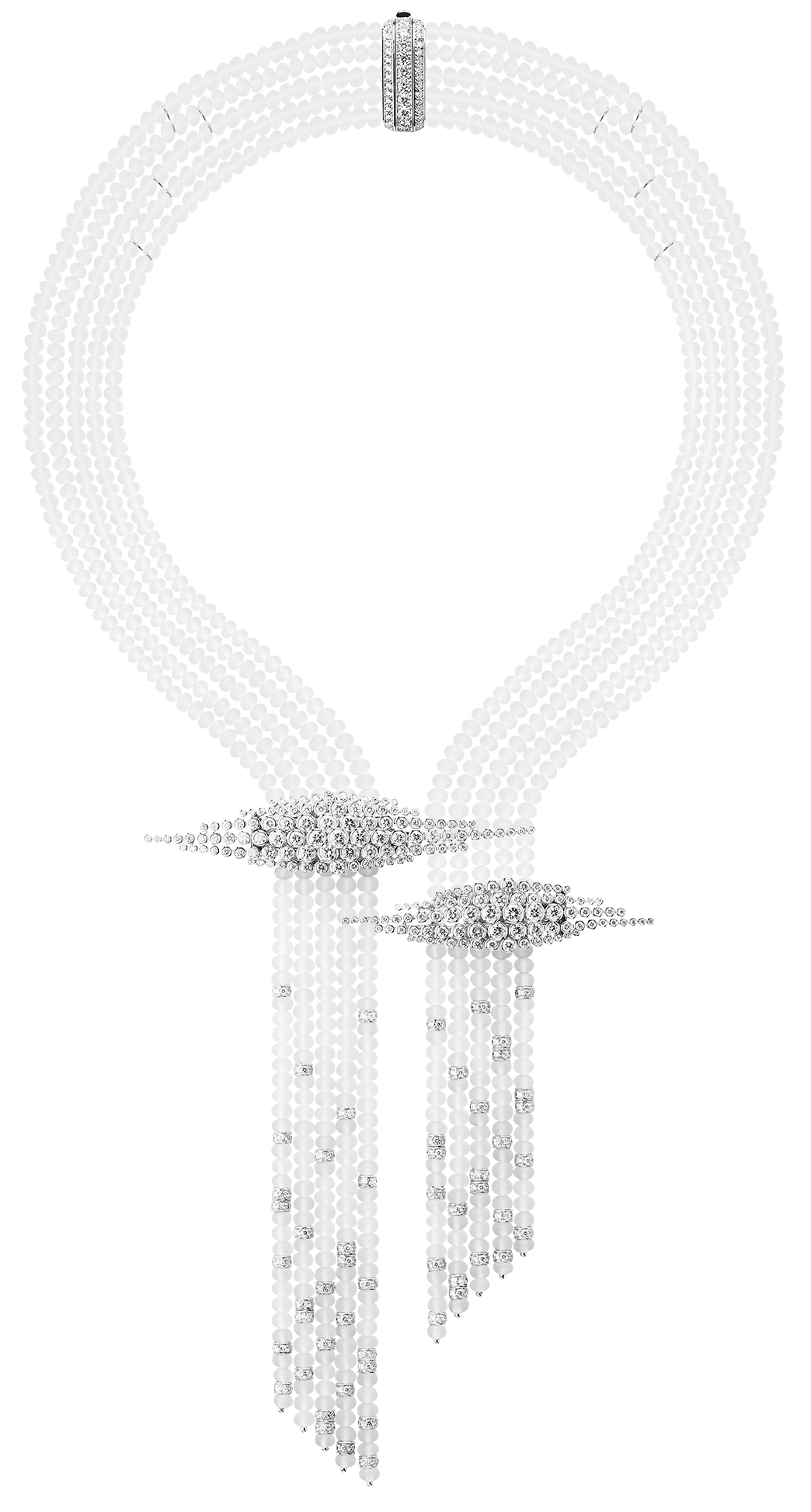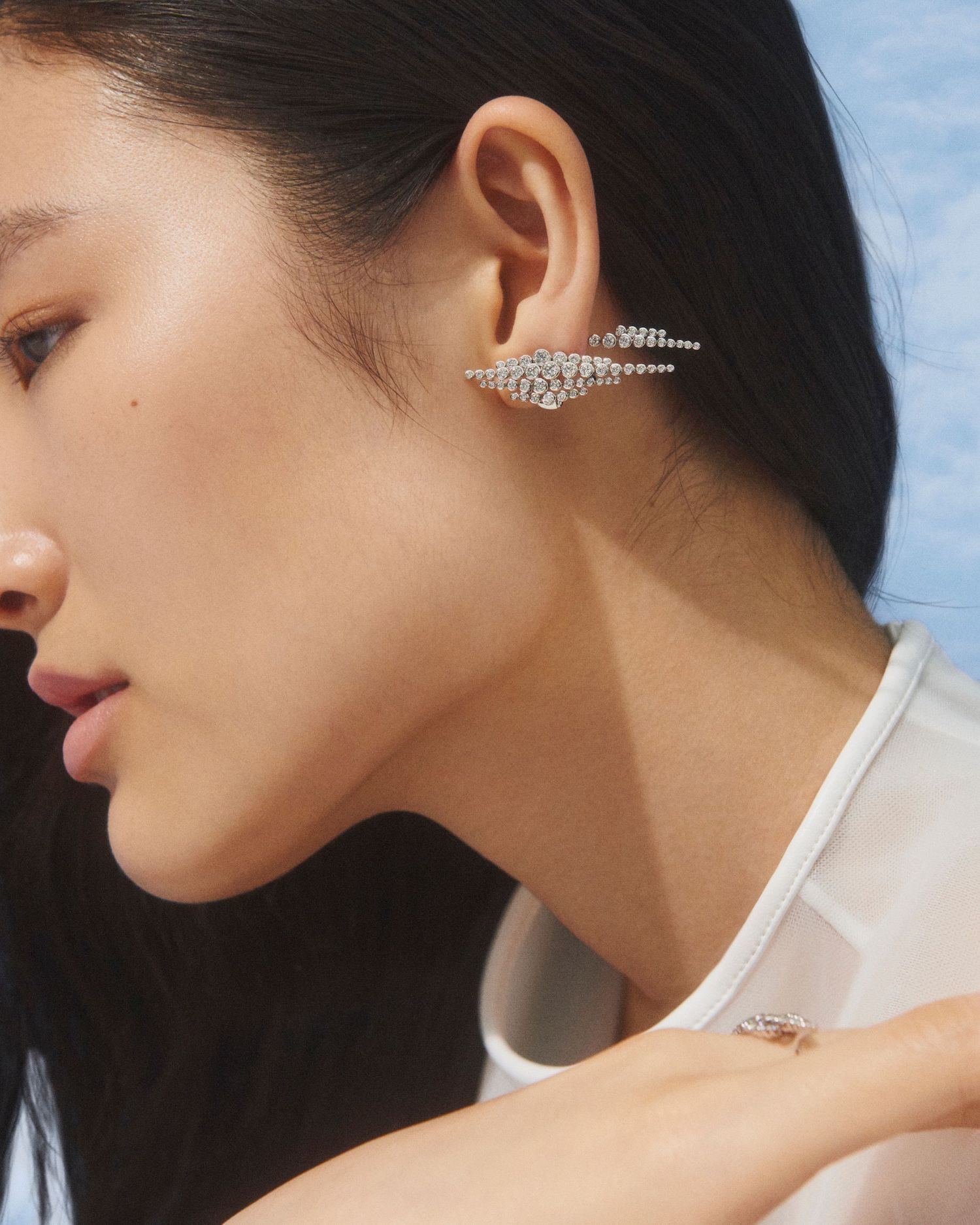 Асимметричные серьги стали ювелирным воплощением облаков, которые окутывают мочку уха ореолом бриллиантов. Облака на кольце словно парят над пальцами, а колье объединяет каскад матовых бусин из горного хрусталя с двумя бриллиантовыми облаками.