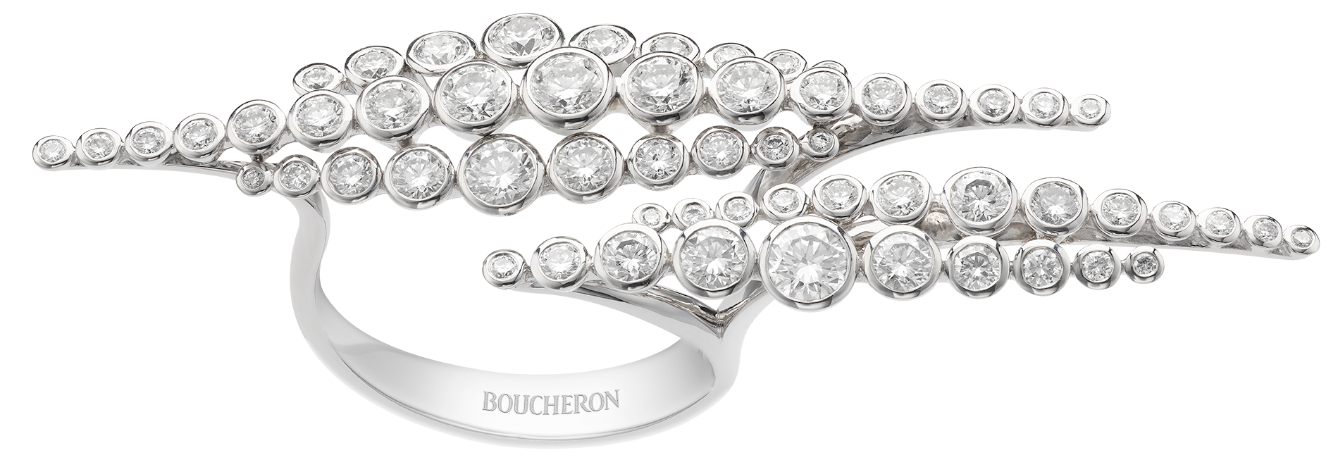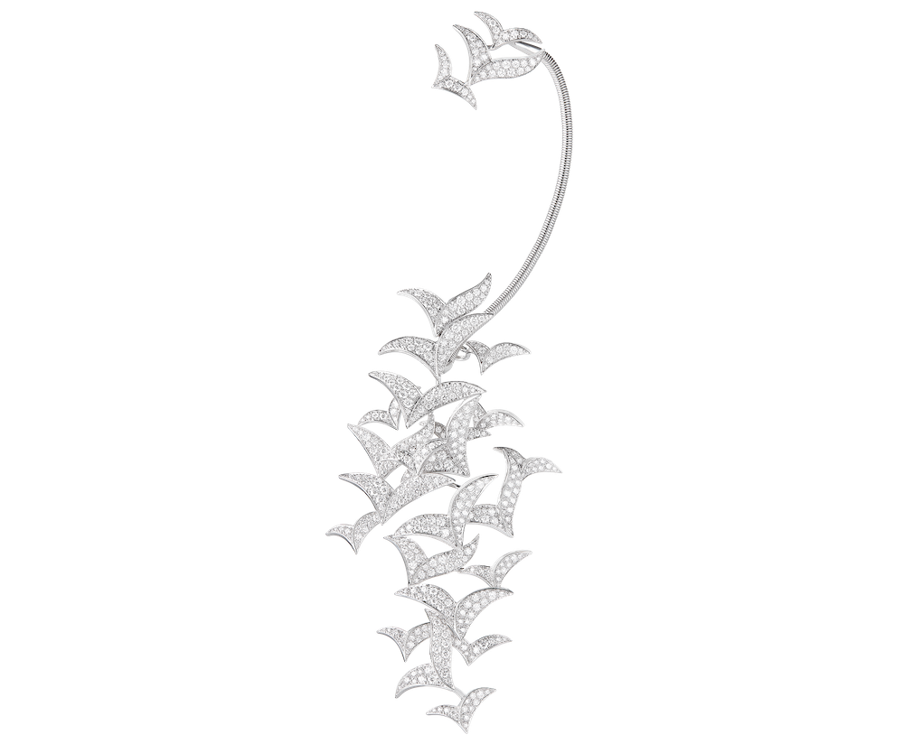 В этих изделиях Boucheron воплощает стаю птиц, кружащих в небе. Величественное зрелище передается лазерной гравировкой внутри горного хрусталя. В прозрачном колье, браслете и кольце птицы грациозно летают между бриллиантовыми обручами. А в длинной асимметричной моносерьге из золота и бриллиантов парит стая объемных птиц.
