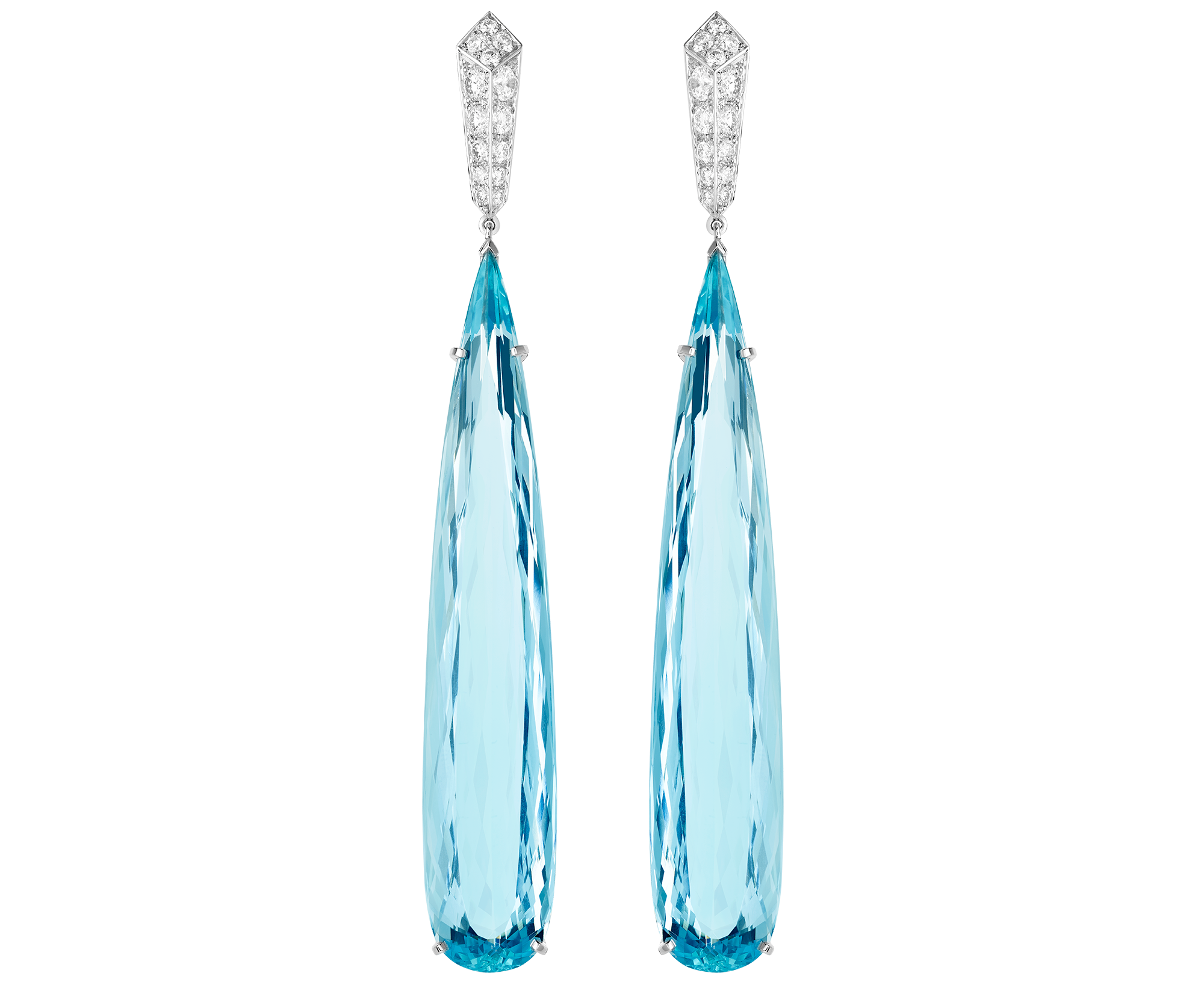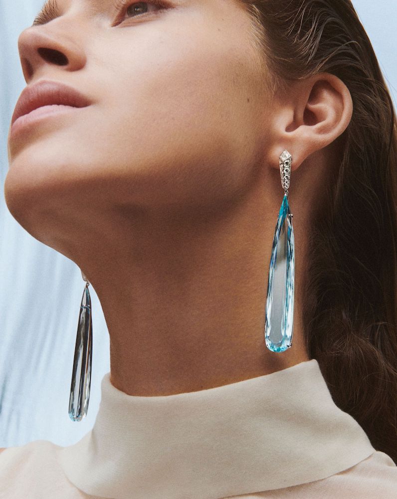 Серьги-подвески вдохновлены каплями дождя, которые постепенно вытягиваются, пока не исчезнут совсем. Капли выполнены из двух аквамаринов очень редкой огранки, каждый из которых составляет около 70 каратов. Кольцо на две фаланги украшено почти 32-каратным аквамарином огранки кабошон.