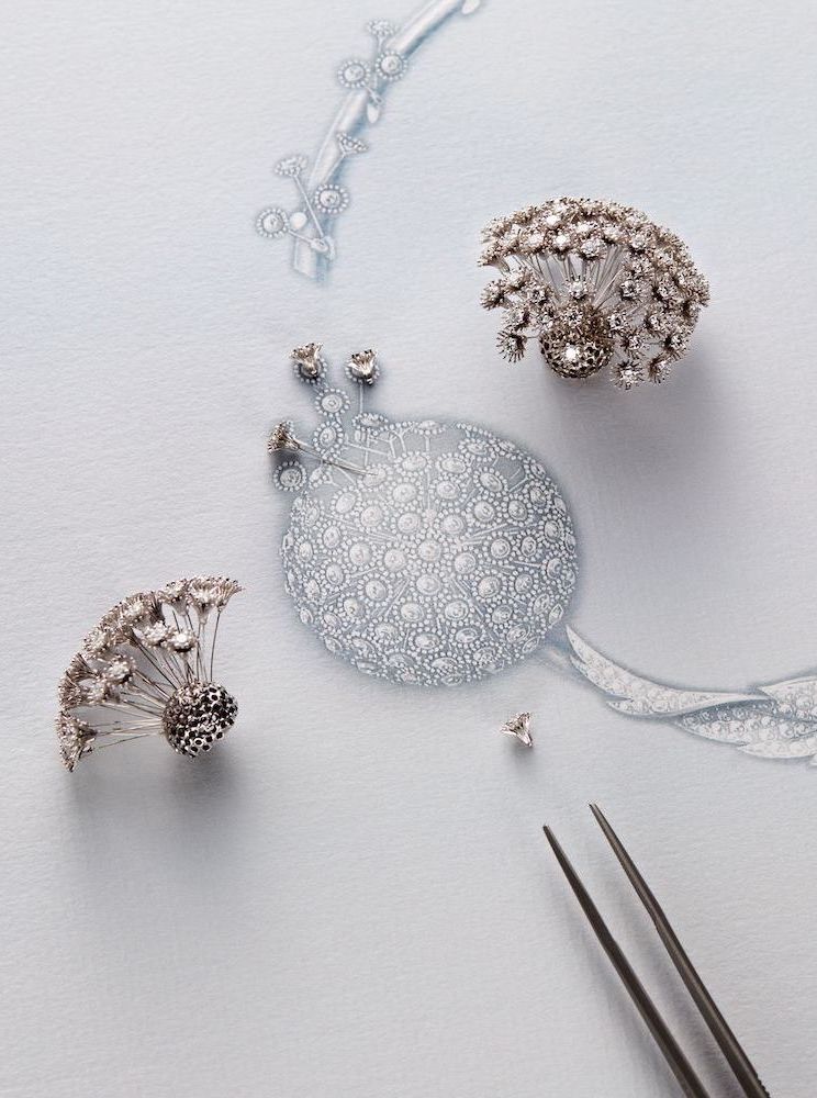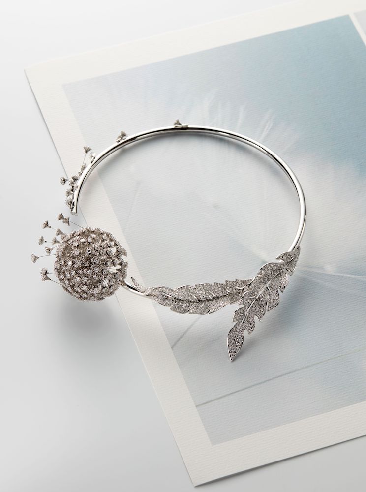 Чтобы передать бесконечную легкость одуванчика, развевающегося на ветру, ювелиры Boucheron взяли титановые нити толщиной с человеческий волос. Легкий и хрупкий одуванчик тонко обвивает шею и запястье, а его бриллиантовые семена дрожат от малейшего жеста. Асимметричные серьги разделяются на головку одуванчика, разбрасывающую семена, и лист, украшающий мочку уха. Объемное кольцо можно носить вместе или без бриллиантового листа.
