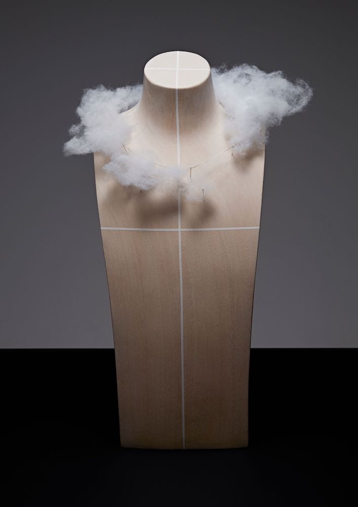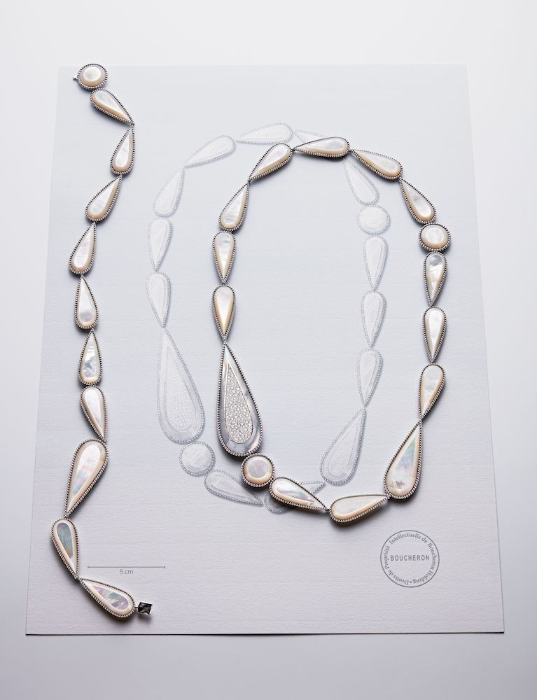 «Я хотела создать настоящее облако, обволакивающее шею женщины», — объясняет Клэр Шуан. Но как можно в ювелирном изделии воспроизвести парообразное действие миллионов капель, которые собираются вместе, образуя облако в природе? Специально для Дома Boucheron программистами был разработан алгоритм для воплощения этого облачного скопления в жизнь. Потребовалось два года, чтобы разработать материалы для этого уникального колье, которое состоит из 9 786 титановых нитей с 4 018 бриллиантами и 4 415 стеклянных бусин, имитирующих капли воды. Чрезвычайно легкое, это колье реагирует на каждое движение шеи и действительно кажется невесомым.