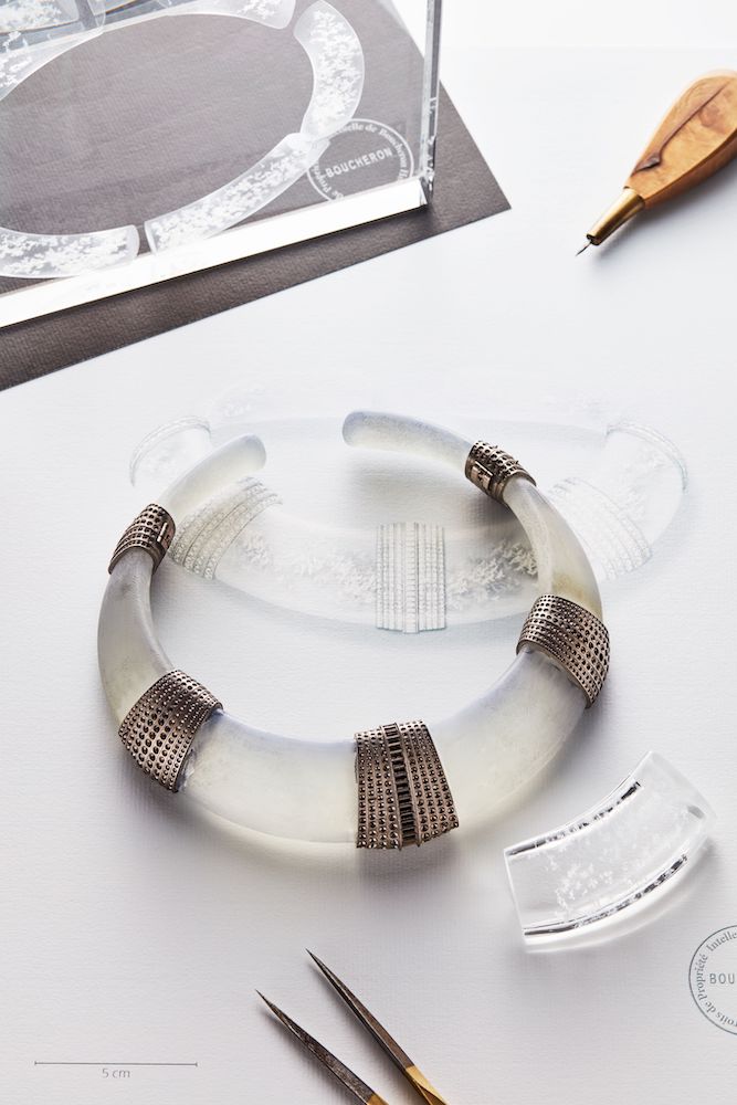 Создание этого колье было чрезвычайно сложным. В течение двух лет ювелиры Boucheron искали материал, который мог бы воспроизвести не только небесную палитру синего цвета, но и его мимолетную, почти неуловимую природу. Во время этих поисков мастера узнали о специальном веществе, которое НАСА использует в космосе для сбора звездной пыли — аэрогеле. Эта загадочная материя, состоящая на 99,8% из воздуха и диоксида кремния, меняет цвет в зависимости от освещения. В украшениях Boucheron этот талисман заключен в оболочку из горного хрусталя с бриллиантами. Сохраняя традицию украшений-трансформеров, мастера сконструировали это колье так, что его можно также носить на шелковой ленте, дополнив браслетом из тех же материалов.