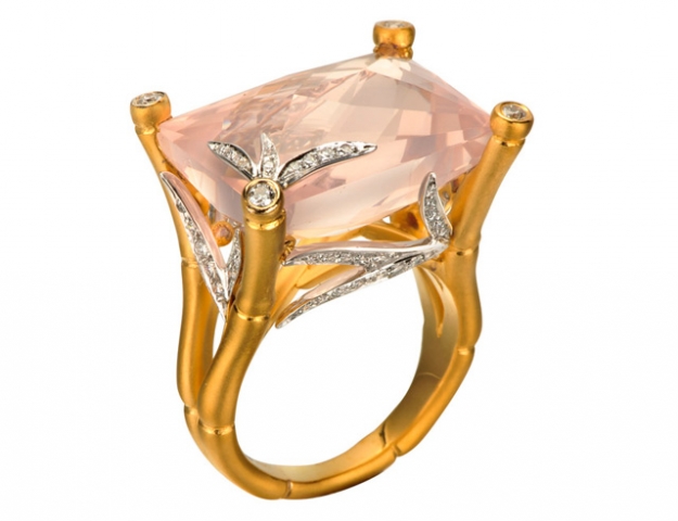Испанская ювелирная компания обновила коллекцию Bambú. Новые украшения добавили ярких красок в прежде спокойную линию драгоценностей. Carrera y Carrera представили два роскошных коктейльных кольца, декорированных цветными камнями — розовым кварцем и аметистом, а также более сдержанный комплект — кольцо, серьги и кулон из желтого и белого золота с бриллиантами.
