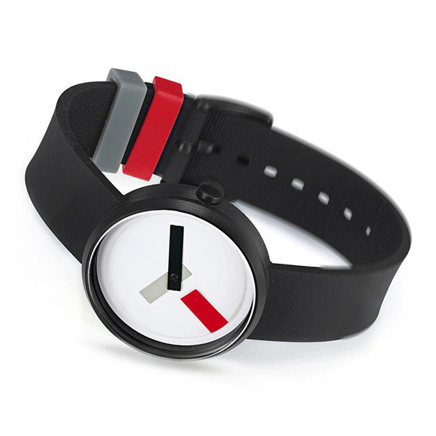 Ссылаясь на картину Малевича «Красный крест на черном круге», дизайнер разместил на контрастном белом циферблате три разноцветных стрелки-прямоугольника, которые ежесекундно образуют новые сочетания цветоформ. Дополняет модель черный силиконовый ремешок с красным и серым фиксаторами.