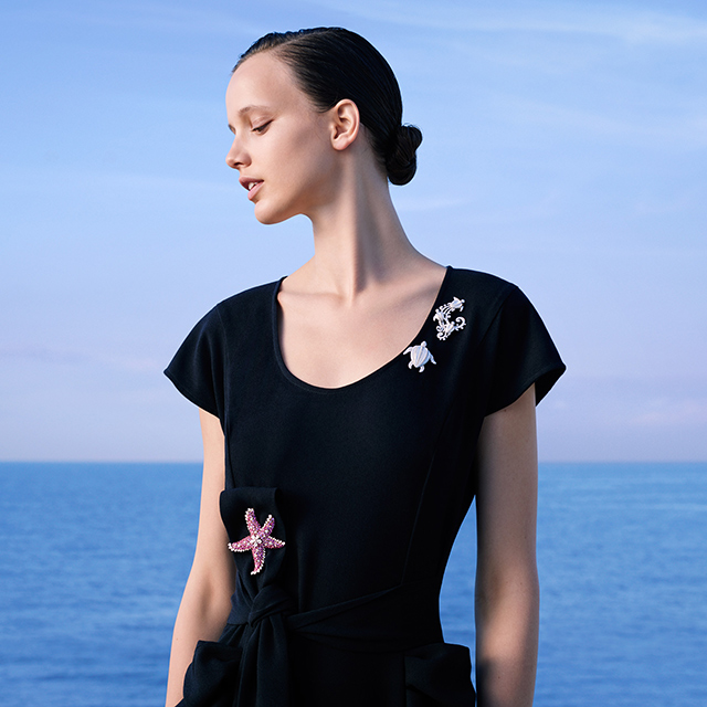 Черепахи (один из любимых образов Van Cleef & Arpels), русалки и морские звезды оживают в ювелирном воплощении, бирюза и прозрачные изумруды напоминают о красоте побережий. Причудливая игра цветов предстает в водной палитре драгоценных камней Pierres de Caractère: фантазия ведет мастеров дома от Средиземного моря к Адриатическому и Аравийскому, от Красного, Каспийского и Черного к Атлантическому и Индийскому океанам. Это дальнее плавание демонстрирует все цветовые нюансы морской воды: от многочисленных оттенков бирюзового до изумрудно-зеленых, оживающих в отблесках полуденного солнца и мерцающих при лунном свете.