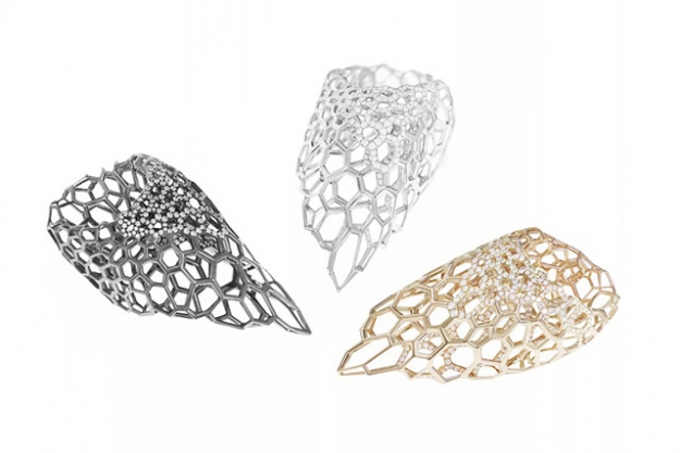 Украшения представлены в белом, желтом, черном и розовом золоте с бриллиантовым паве и имеют форму сетки или паутинки из тонких нитей, спутанных в клубок. На Art Basel коллекция будет выставлена в Colette Art Drive-Thru at Alchemist.