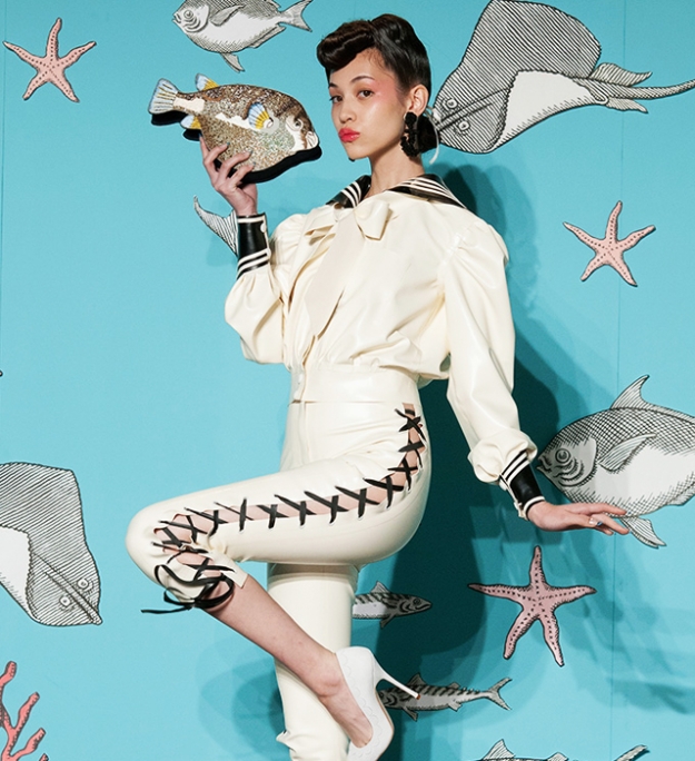Одежда: короткие топы и шорты в сине-белую полоску, мини-платья на пуговицах, с погонами и золотыми цепями, костюм с широкими брюками, блузки с узорами, моряков, якорей и рыб, платья-халаты, мини-платья с пышными юбками и отложными воротниками.