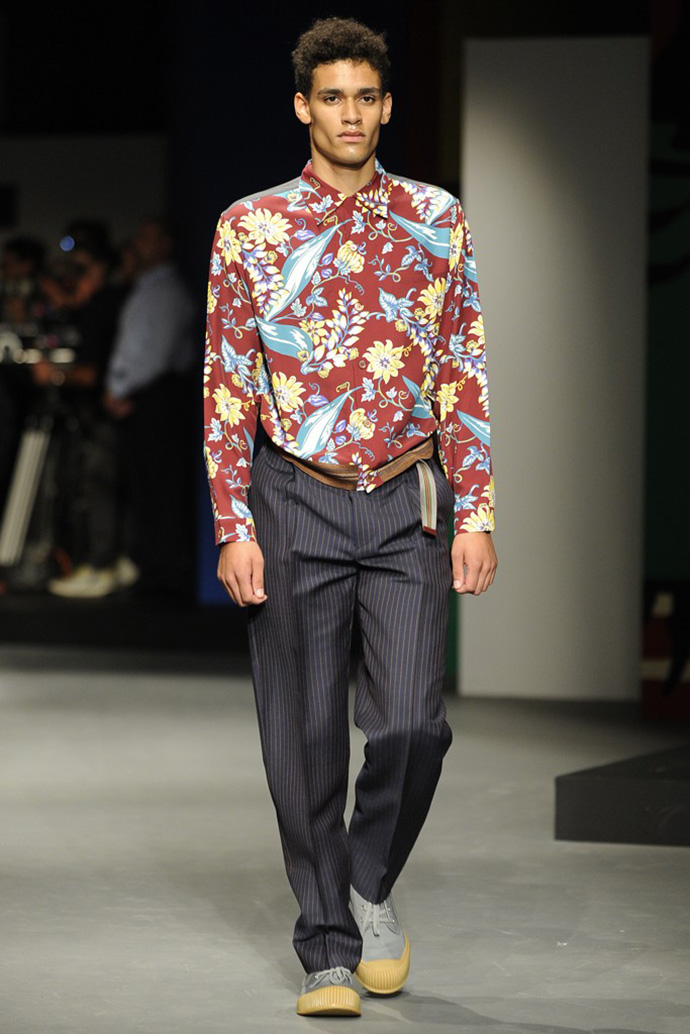 "Нуар, снятый в предвоенном Гонолулу," — так назвали мужскую весенне-летнюю коллекцию Prada журналисты WWD. Мужские образы, составленные из рубашек с гавайскими цветами, "отпускных" полуспортивных туфель и костюмов, "разбитых" по цветам пиджака и брюк, и правда выглядели слегка мрачно и по-военному. Наверное, всему виной яркие, "раздраженные" цвета — подозрительный оранжевый, кровавый красный, напряженный синий и обреченный черный. И, разумеется, принты в виде девушек pin-up и закатного солнца — атрибуты образа ушедших на войну мужчин, которые тоскуют по дому и развлечениям. Кстати, девушки на показе тоже были — одетые в стиле конца 1930-х — начала 1940-х, в романтичные платья с принтами и кеды с носочками.