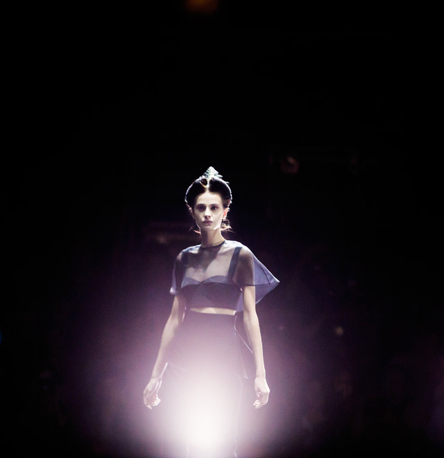 Дизайнер "посадил" мушек на платья в стиле new look с пышными юбками, узкими талиями и облегающими корсетами. Раскрасил асимметричным принтом, напоминающим одновременно фасеточные мушиные глаза и узор на крыльях, топы и брюки. Лихо выкроил силуэты жакетов, напоминающих не то экзотических бабочек, не то летящих жуков. Смешал несколько чистых цветов (красный, белый, темно-синий и черный). Добавил баски, кружевные вставки и наслоил это все друг на друга, получив в итоге необычайно красивое и гармоничное действо. Аксессуарами послужили красные туфли на каблуках, гармонирующие с макияжем, и винтажного вида диадемы.