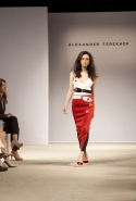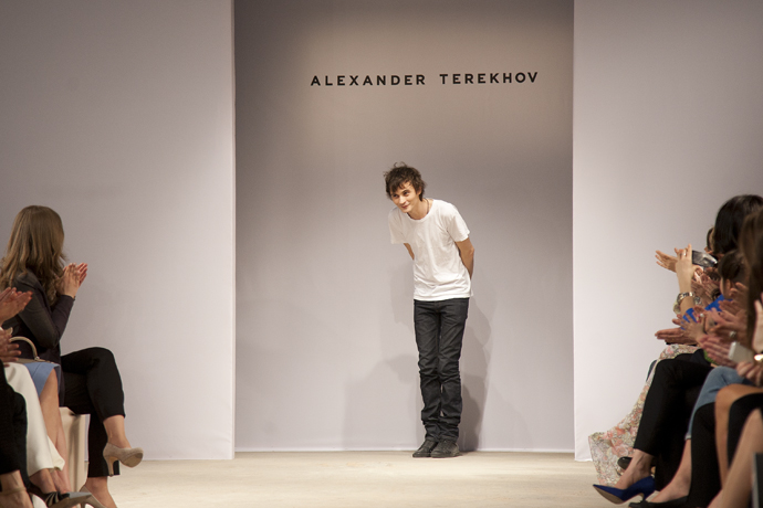 Модели выходили на подиум в туфлях, сделанных в сотрудничестве с маркой Gianvito Rossi, и с сумками, созданными для Alexander Terekhov нью-йоркским брендом Khirma Eliazov.
