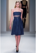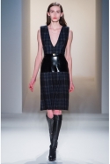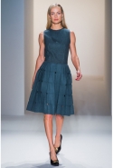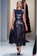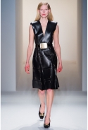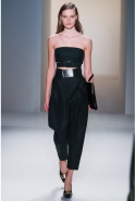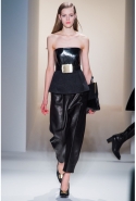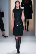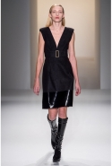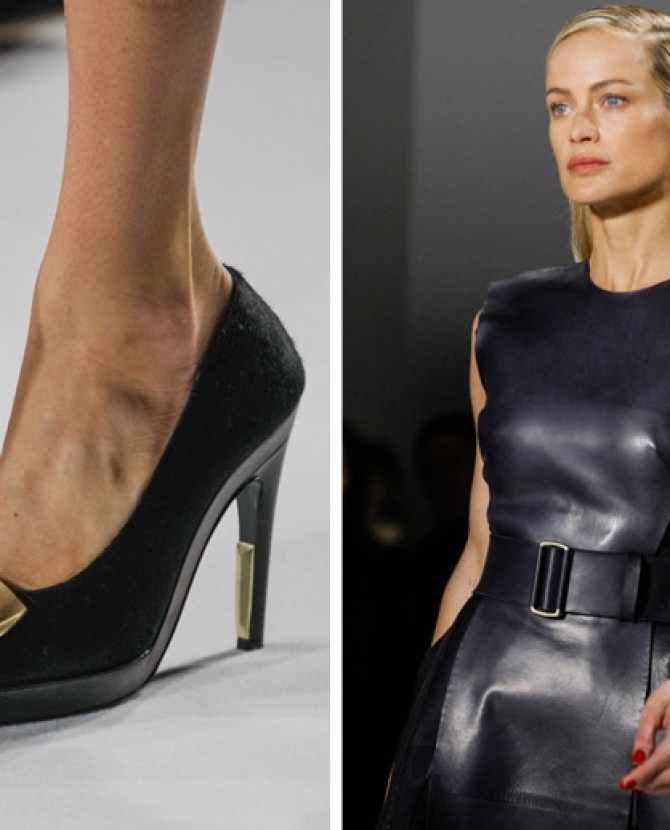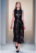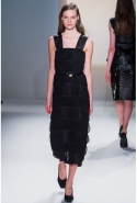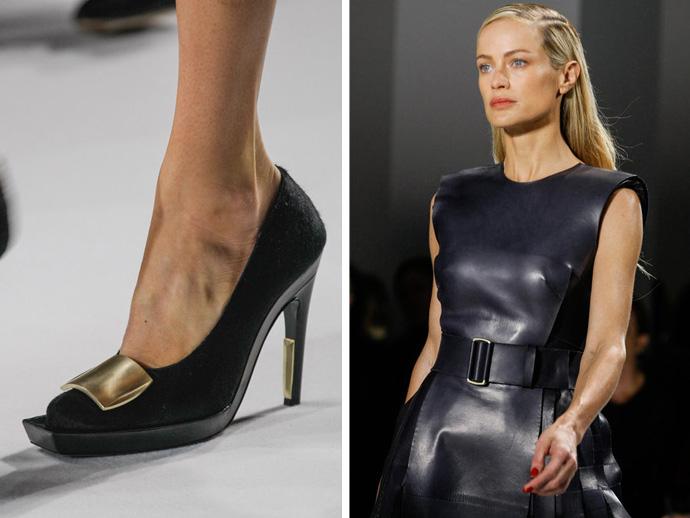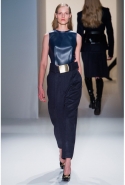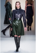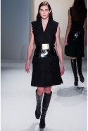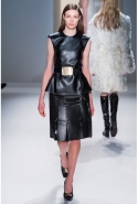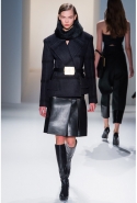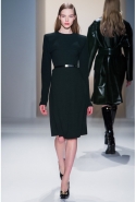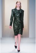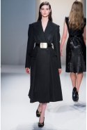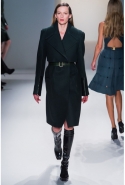 Как перевести на язык моды такие понятия, как сила и женственность? Коста выбрал для этого сочетание плотной шерсти, винила или кожи. Квинтэссенцией этого приема, привносящего в классический и элегантный крой силу и мужественность, стали юбочные костюмы, сочетающие плотные шерстяные материалы и кожу. Обезличенный "униформистский" хаки — стилистически мы все-таки находимся где-то посреди военного пожара 1940-х — дизайнер заменил на роскошный и благородный эвкалиптовый. Calvin Klein Collection, как всегда, изобилует очень сильными кожаными вещами: темно-зеленое пальто, платье до колена похожего оттенка, ансамбль из сине-серой сорочки и широкой темно-зеленой юбки продемонстрировали первоклассное "кутюрное" качество шитья и владение цветом. Юбки длинных платьев без рукавов, представленных в конце коллекции, были отделаны строчкой, перфорацией и прорезями: трудно поверить, что эти пластичные и динамичные модели сделаны из кожи!