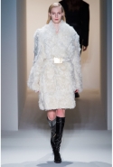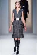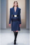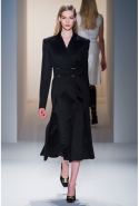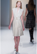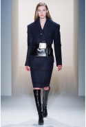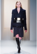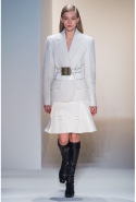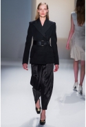 Легкое дыхание моды 1940-х, обращение к военной форме, четкие формы и классические "зимние" ткани, зачастую позаимствованные из мужской моды (крупная клетка, рисунок "принц Уэльский") стали определяющими темами коллекции. Широкие и объемные покатые плечи — не самый женственный тип кроя. Но Косте удалось сбить "брутальность" такой конструкции благодаря эффектному аксессуару — узкому поясу с массивной металлической пряжкой. Эта визуально очень активная деталь присутствовала и в юбочных костюмах, и в пальто.