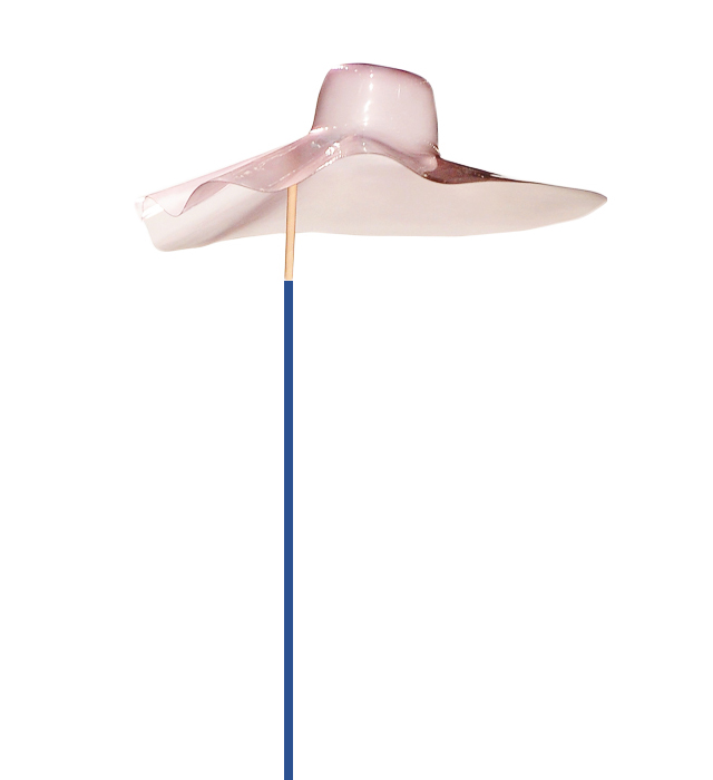 Так случилось и на этот раз, причем уже в самом начале показа. Модель появилась перед публикой в коротком полосатом платье, которое вскоре приветственно распахнула, словно это было пляжное полотенце. Под ним оказалось белое боди, пришитое к "полотенцу" и составлявшее с ним одно целое. Можно было предположить, что Чалаян держал в уме посетительницу пляжа, одетую в сплошной купальник и вытиравшуюся после купания. Ассоциацию отчасти подтверждали последовавшие затем зонты с широкополыми летними шляпами вместо куполов — без вещей-гибридов дизайнер не мыслит свое творчество.