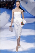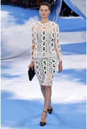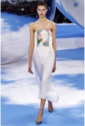 Раф Симонс раз за разом берет основные диоровские коды и остраняет их — пытается взглянуть на них со странной, неожиданной, необычной точки зрения. Он начал с главного — знаменитой диоровской метафоры "женщина-цветок". Он всячески жонглировал ею, то буквально реализуя в виде стен из цветов и зеленых кустов, то делая максимально декоративной — мотивом на ткани или вышивкой на платье. Вчера цветы поднимались от щиколоток к коленям, обвивали бедра и ложились на плечи — в узорах на сапогах и платьях — то оставаясь плоскими, то приобретая объем за счет бисера и пайеток.