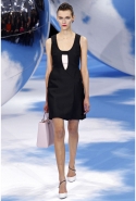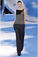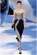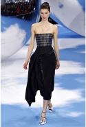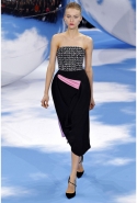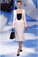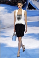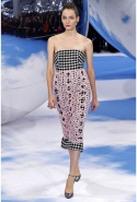 Рядом возникает черно-белая клетка pied-de-poule, которая украшала сначала флаконы духов Miss Dior, а потом и Diorella, Diorling, Diorissimo. Эта "куринная лапка" отпечатана на узком корсетном платье, поверх которого натянута нежно-розовая, словно связанная крючком юбка, на туфлях, на топах и на корсажах.