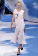 Вдруг на скучноватых классических диоровских сумках появились остроносые туфли — как и на свободных белых и черных шелковых платьях, рядом с женскими головками, голубками и руками с букетами. Эти принты сделаны по ранним рисункам Уорхола как раз 50-х годов. Некоторые из них напоминают знаменитые иллюстрации Рене Грюо, еще один диоровский код, и в этом нет ничего удивительного — молодой Уорхол работал для Vogue и Harper's Bazaar, рисовал рекламу для производителей обуви.