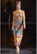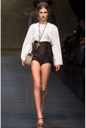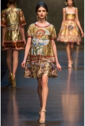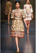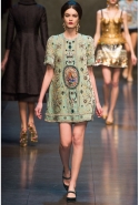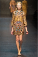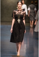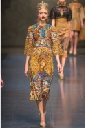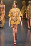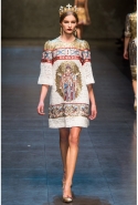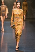 Ее "византийская" часть роскошна, зрелищна, по-искусствоведчески скрупулезна, подробна и точна. По ней, как и по многим предыдущим коллекциям Dolce & Gabbana, можно получить представление о целом пласте итальянской культуры. Не говоря уже о том, что эти модели, сочетающие цвет сусального и матового золота и традиционные оттенки мозаик — охра, голубой, бордовый, светло-коричневый, бледно-зеленый, дополненные точными историческими "аксессуарами" (украшенные яркими камнями византийские короны, крупные серьги, кресты на цепочках), хорошо "работают" оптически и очевидно вызовут ажиотаж модных редакторов и стилистов. А некоторые из них — например, короткое "золотое" платье на бретелях с расклешенной юбкой, мини-платье с прямым силуэтом и рукавами "три четверти" из ткани, на котором и воспроизведен рисунок кружева и мозаичный орнамент, и, конечно, вышитое серебристо-золотыми пайетками узкое платье с образом ангела на груди — можно вполне отнести к коммерческим.