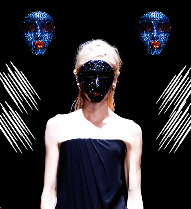 Но главную скрипку играли щедро задрапированные платья из джерси. Они были явно навеяны древнегреческими туниками и древнеримскими тогами. Некоторые имели довольно воинственный вид, который им придавала кожаная «сбруя» - ремни, обвивавшие шею. Встречались и цветастые глухие платья с узорами в африканском стиле – Африка, похоже, тоже стало одной из тем этой коллекции. Что подтверждали и маски на лицах моделей, как у воинов туземных племен.