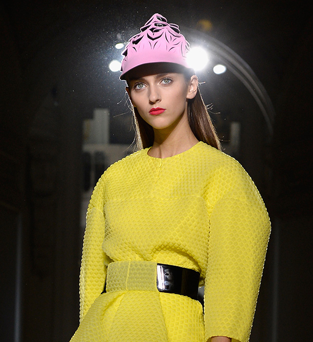Чрезмерность и театральность всегда были частью эстетики модного дома John Galliano, и Билл Гейтен об этом хорошо осведомлен. Это видно с первых выходов показа весна-лето 2014: расшитые цветами мини-платья дополнялись рельефными кепками и босоножками с жесткими прямоугольными бантами и на высокой платформе.