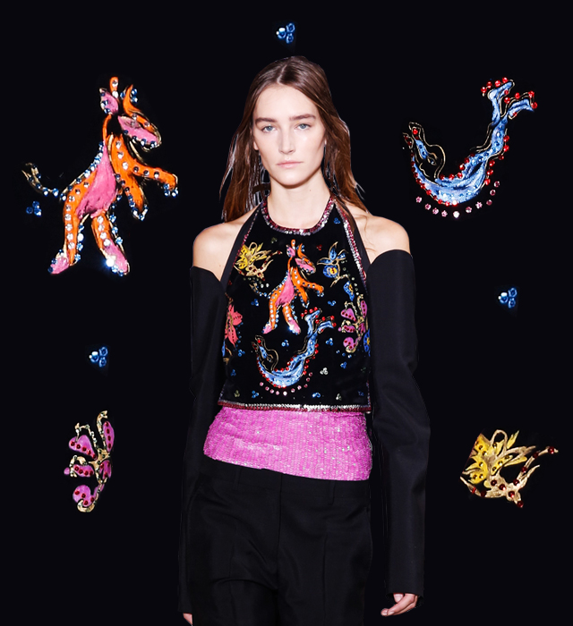 Публика уж было приготовилась к длинной лекции на тему мужского костюма, но дальше все оказалось куда веселее. Последовало, к примеру, замечательные бюстье, расшитое кристаллами и пайетками в духе танцовщиц варьете. Оно было надето поверх строгого мужского жилета. Этот бурлеск добавил шоу зрелищности, а коллекции женственности и сексапильности.