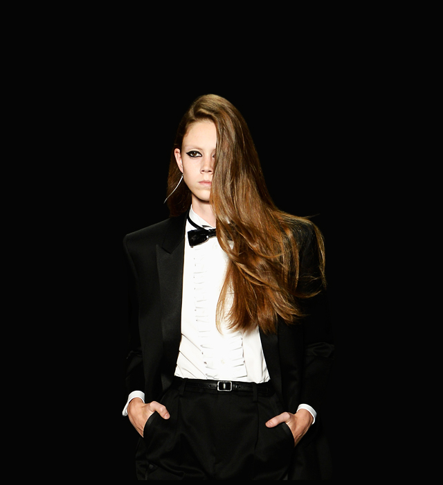 И еще один характерный ироничный слимановский жест: вы думаете, что раз Saint Laurent, то непременно должны быть смокинги? Так нате вам — и хитро подрезанный смокинг, и из черной кожи, и с воротником-шалькой, и прямой и короткий с блестящими лацканами, и словно с мужского плеча — достаточно или хотите еще?