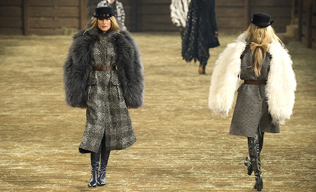 Классические вещи Chanel Лагерфельд легко адаптирует под американские образы: сапожки с твидовыми ретро-костюмами, связки жемчужных нитей, завязанные на шеях в небрежные крупные узлы, скрещенные пистолеты на поясах черных юбок, замотанные платками с логотипами Chanel лица и глаза, угрожающе блестящие из-под полей ковбойских шляп. Но главная роль, конечно, досталась индейцам — километры бахромы, которой обрастают даже классические стеганые сумки Chanel, национальные индейские узоры и вышивки, перья в волосах моделей, наряды настоящих Покахонтас, огромные пончо-одеяла. А из-под традиционного пончо выглядывает абсолютно современный костюм из черной жатой кожи, с лацканами и отворотами в золотых заклепках.