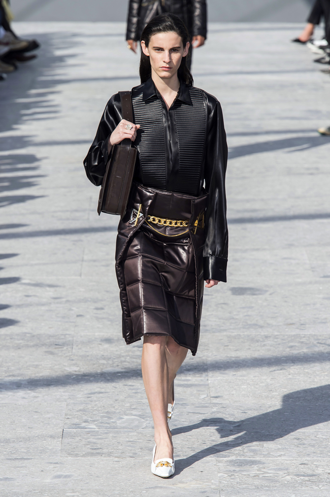 Самая важная новость Парижской недели моды: не было замечено ни одной пары Triple S. Кроссовок вообще стало гораздо меньше, как и каблуков. Дизайнеры хоть и по-прежнему озабочены приданием женщине силы, но в моменте предпочитают делать это через сапоги до колена, полуботинки, ботинки и дериваты балеток. Я отметила невероятные гибридные ботинки Miu Miu на высокой платформе, гибрид «походного» носка и лоферов Chloe, лаковые кинки-ботинки у Dries van Noten с прорезиненным низом и байкерские Bottega Veneta, полуботинки Burberry с кристаллами, как от люстры, остроносые модели Louis Vuitton с «перемоткой» на щиколотке и классную интерпретацию массивных шнурованных bowers у Versace.