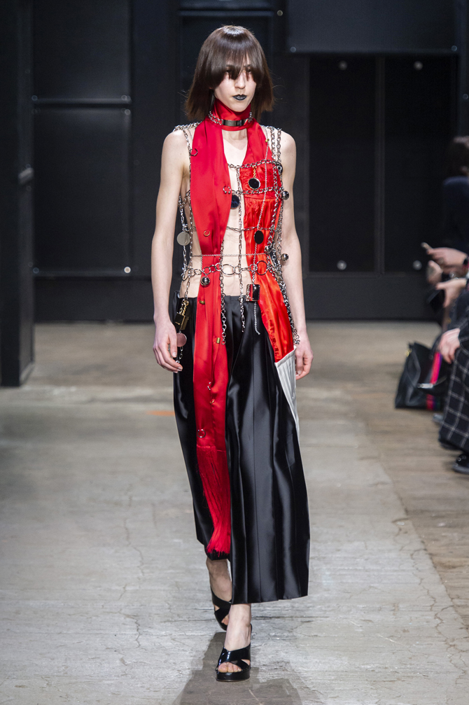 Сумки, которые симметрично крепятся на шею как варежки или на манер панье вокруг талии. Трансформировали бы их уже в объемные накладные карманы, как сделали Рик Оуэнс и Прада. Фейковая готика не может обойтись без «красных шапочек» в кейпах. Но кейп — это уже не романтично, а очень избито. Еще надоели объёмные платья — пора двигаться дальше в плане кутюрных техник. А еще кроше, воланы и рюши.