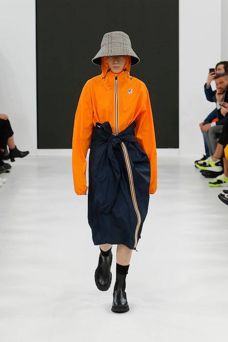 Французская марка K-Way стала популярной в 1965 году, выпустив нейлоновую ветровку — вещь не просто надежную, но и компактную: она складывалась в карман и превращалась в сумку. Для того времени это был прорыв (можно было не таскать с собой громоздкие зонты). С тех пор бренд демонстрирует, какой должна быть технологичная одежда здорового человека — легкого на подъем, бесстрашного перед ливнями, который собирает чемодан за пять минут и не боится, что вещи помнутся. На Pitti Uomo бренд провел свое первое фэшн-шоу. У K-Way получилась бодрая коллекция для людей, которые ценят практичность и не чураются самоиронии — потому что как без отменного чувства юмора можно носить плиссированные юбки из флиса, анораки в «гусиную лапку», рыбацкие зюйдвестки и сумки в форме фрисби?