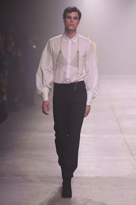 Самое громкое событие выставки Pitti Uomo — показ гениального Стефано Пилати, бывшего дизайнера Yves Saint Laurent, а после — Agnona и Ermenegildo Zegna. Всего в моде Пилати работает около 30 лет. Три года назад он переехал в Берлин и обрел независимость, запустив собственный бренд. В интервью Business of Fashion Стефано Пилати признавался, что в молодости тусовки проходили мимо него, поэтому переезд в Берлин и вечеринки в Бергхайне стали глотком свежего воздуха — под этим влиянием и создаются коллекции Random Identities. Почерк дизайнера узнается моментально — это аккуратная работа с силуэтом, объемом, это строгие и функциональные вещи: изящный тейлоринг вне гендера, тонко прочувствованная бельевая тема с бра из цепочек и кружевом на строгих рубашках.