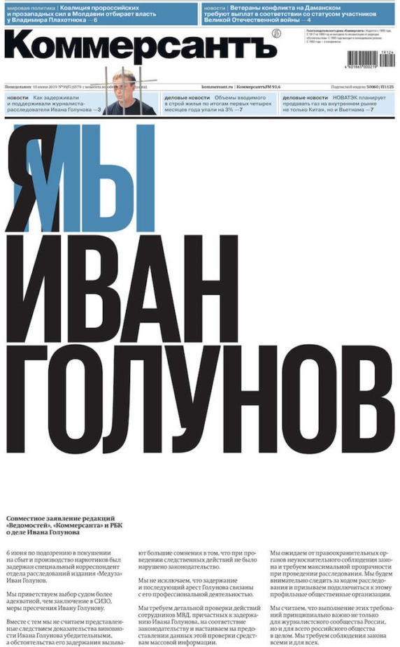 «Самая важная обложка года — пускай не журнала, а газеты. Комментарии тут излишни, кроме одного, пусть и очевидного: когда мы вместе, мы сильнее. Вместо того, чтобы все время соперничать, мы можем вместе бороться и строить то будущее, которому сможем верить. Я очень горжусь российскими медиа за их освещение дела Ивана Голунова и особенно за три эти обложки».
