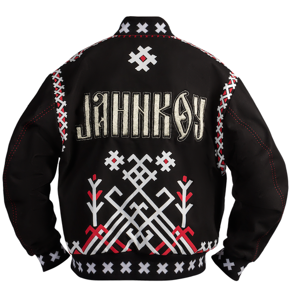 У Марии Казаковой, дизайнера марки Jahnkoy, получается соединять streetwear с национальными элементами и отсылками к российской культуре. Она переосмысляет традиционный костюм, изучает локальные ремесленные техники — например, расшивает стразами Swarovski павловопосадские платки, а для спортивных костюмов использует бисерную вышивку. В рамках проекта с Rustrends Мария представила еще не законченную работу — бомбер, на котором швеи «Городецкой вышивки» создадут древо мира. По задумке Марии, вышивка станет символом единства рода, а также связью между тремя мирами — культурой, модой и повседневной жизнью.