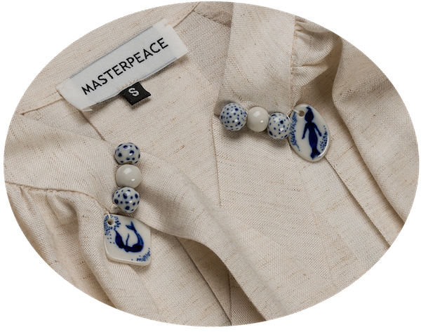 Дизайнер MasterPeace Евгения Линович говорит, что гжель напоминает ей о тату, а культура татуировок ее всегда завораживала: «У меня получилось объединить эти плохо совместимые вещи. Я взяла русалочку случайно — мне понравились работы одного датского тату-художника с этим персонажем. Моя русалка нарисована как скетч: быстро, решительно, эмоционально, на одном дыхании. У нее мало деталей, как у ретро-тату. А сами фарфоровые подвески — как осколки антикварной посуды: как будто я на кухне бабушки и деда и одновременно в арт-студии, скажем, района Шордич в Лондоне».