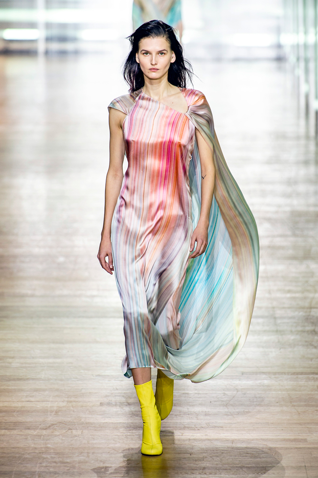 Кроме того что Поля Пуаре считают дизайнером, освободившим женщин от корсетов, кутюрье в свое время еще и научил не бояться красного, зеленого, синего и оранжевого цветов, даже если все они сочетаются в одном образе. Такое же внимание цвету уделяет и китайский дизайнер Йикинг Йин — напомним, модный дом открылся вновь спустя 89 лет после закрытия. Во второй коллекции для дома Poiret она показала результат сотрудничества с французским художником Бернаром Фризом: три его работы — Elu, Der и Navia — превратились в юбки и легкие платья с градиентом.