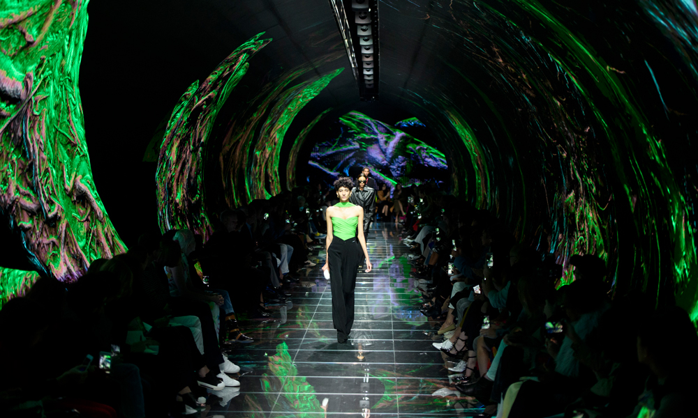 Демна Гвасалия познакомился с Рафманом в июне на ярмарке Art Basel — результатом трехмесячного сотрудничества стал футуристичный туннель для показа весенне-летней коллекции: на стенах, потолке и полу выводились видеопроекции, напоминающие