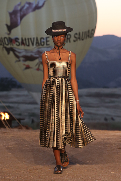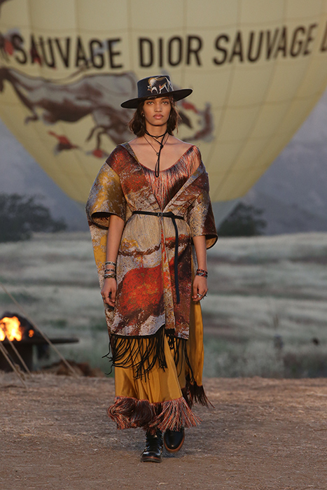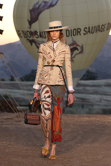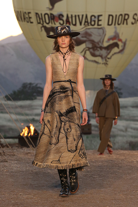 Круизную коллекцию Christian Dior креативный директор Мария Грация Кьюри представила в горах Санта-Моники. По словам дизайнера, коллекция посвящена связи женщины с природой. Отправная точка в мудборде — пещера Ласко, случайно открытая в 1940 году четырьмя подростками. В 1951 году Кристиан Диор выпустил коллекцию, вдохновленную наскальными рисунками из пещеры, а теперь этот ход повторила Кьюри. Дизайнер перенесла древние изображения на полупрозрачные платья в пол, вязаные накидки и шубы. В мудборде коллекции также есть работы художницы Джорджии О’Кифф и колода Таро женского начала, которую создали Карен Вогел и Вики Нобл. Каждый образ из коллекции дополнен шляпой — с изображением животного или расшитой камнями.