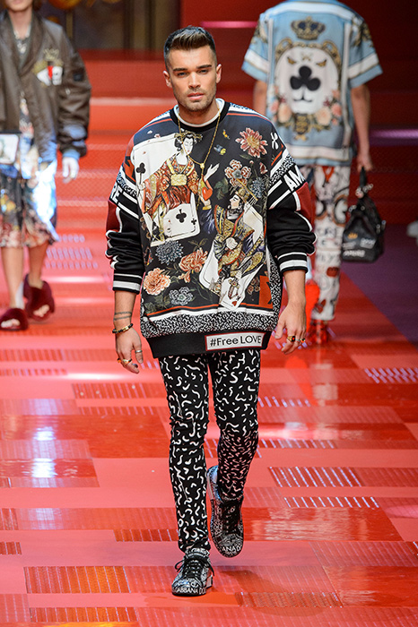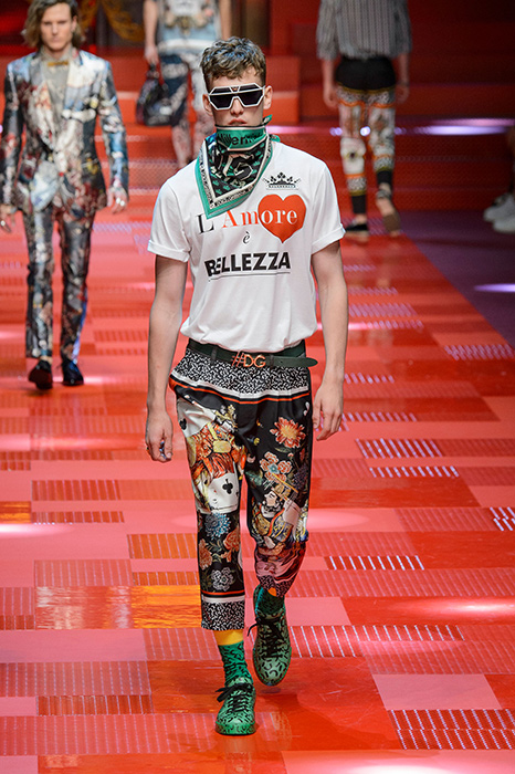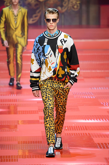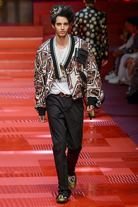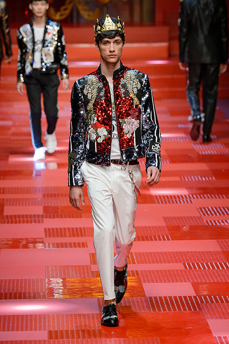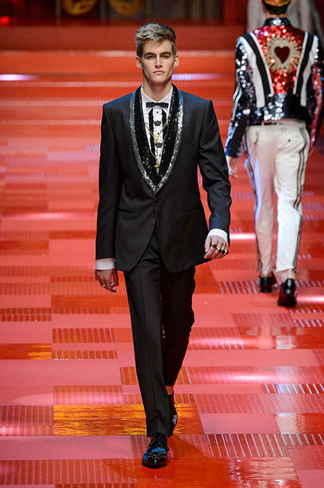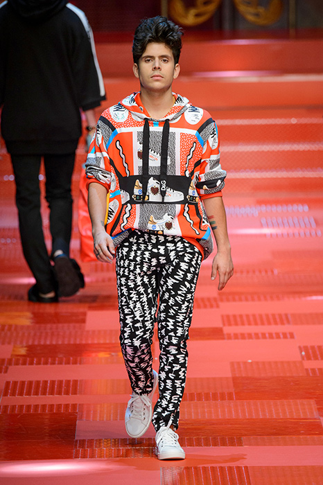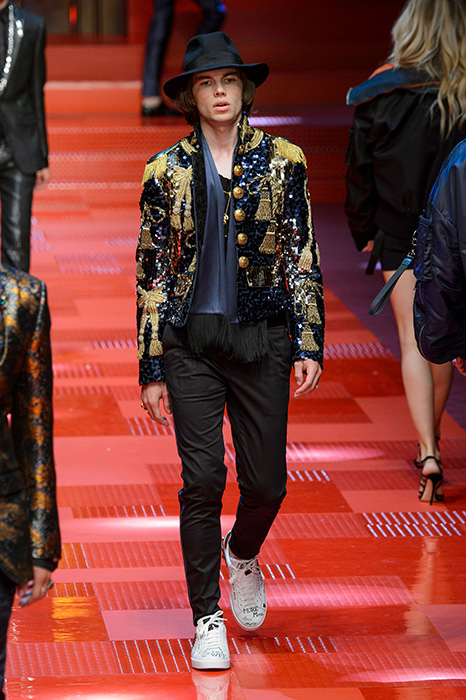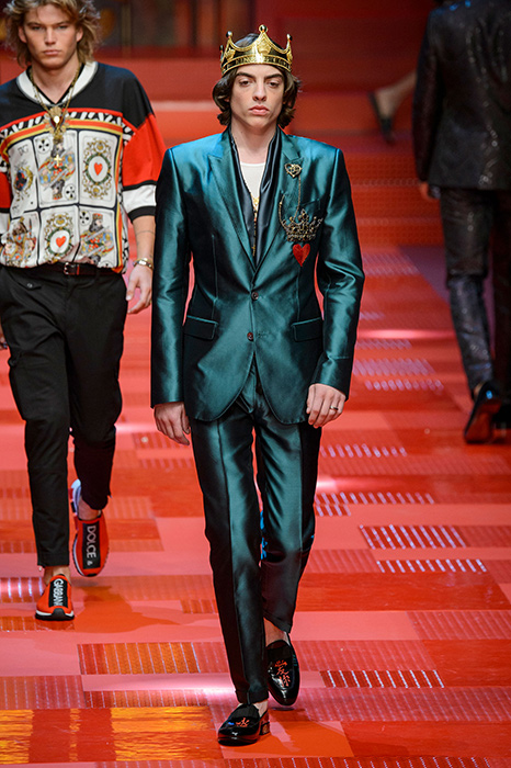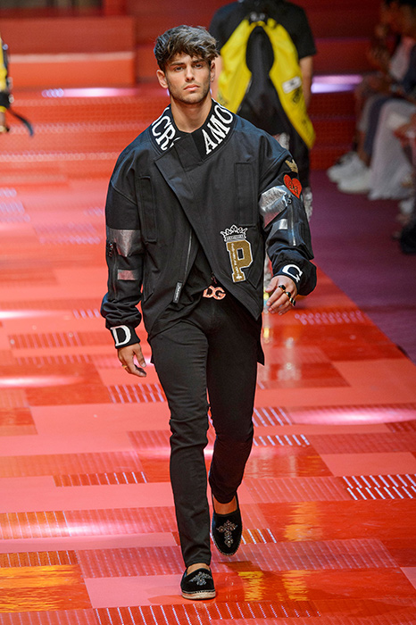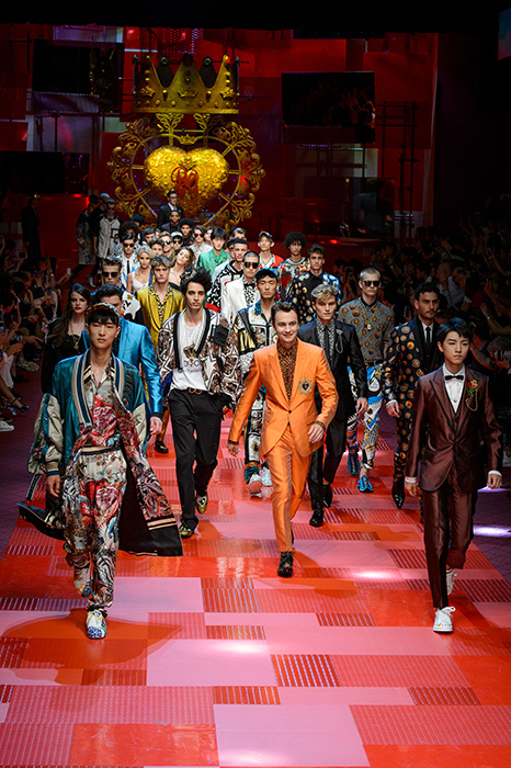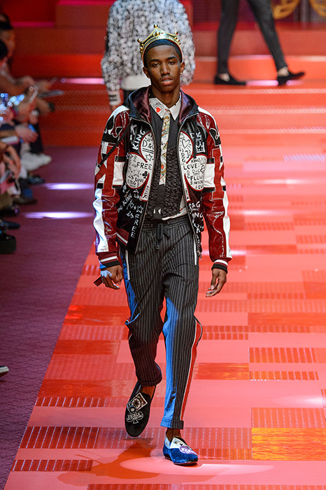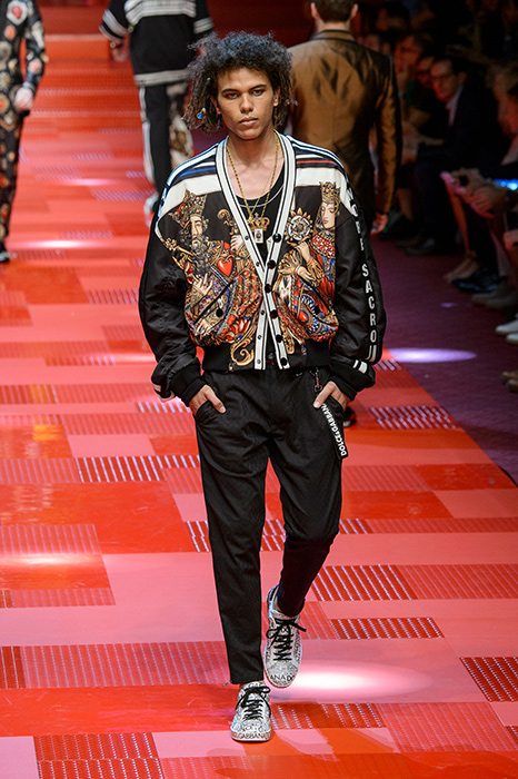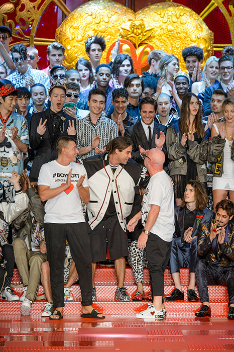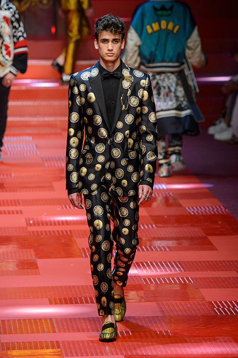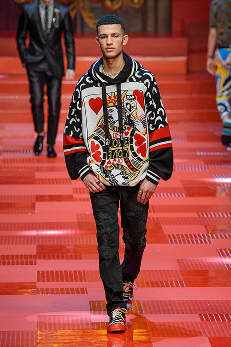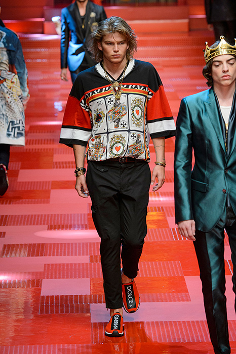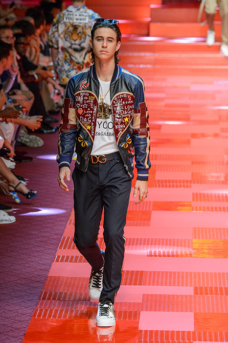 Кастинг прошлого показа женской коллекции сезона осень-зима Dolce & Gabbana в основном состоял из преданных поклонников дизайнерского дуэта: светских львиц, известных инстаграм-блогеров и звездных миллениалов. Бренд продолжил развиваться в сторону молодого покупателя и в качестве моделей для шоу мужской коллекции весна-лето 2018 привлек молодых блогеров и детей знаменитостей: среди них были племянник Билла Клинтона Тайлер, сын Памелы Андерсон и Томми Ли Брэндон, сын Изабеллы Росселини Роберто и многие другие. Что касается самой коллекции, то здесь дизайнеры остаются верными своей любви к эклектике. Так, здесь появились уже знакомые и любимые фанатами бренда яркие принты, громкие надписи и обилие вышивки, а также костюмы из атласа.