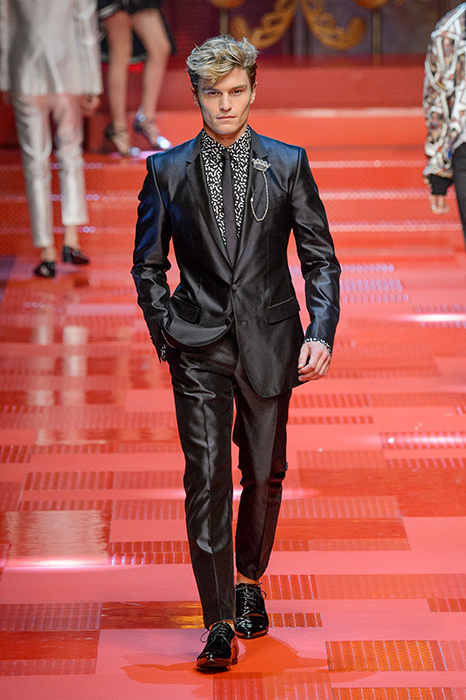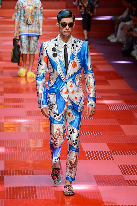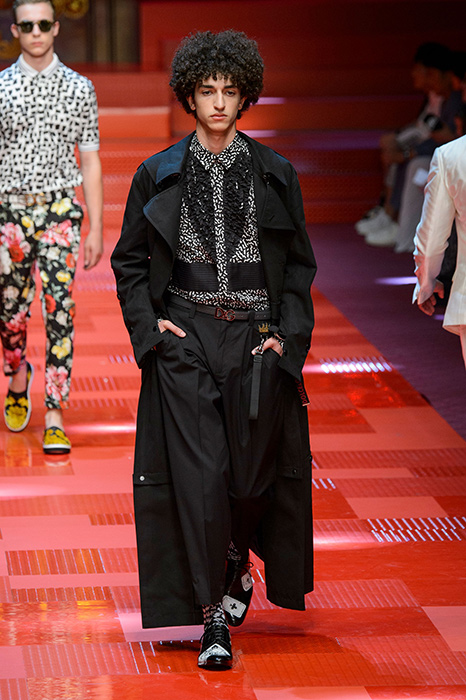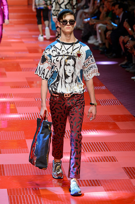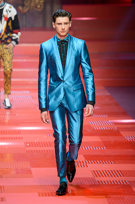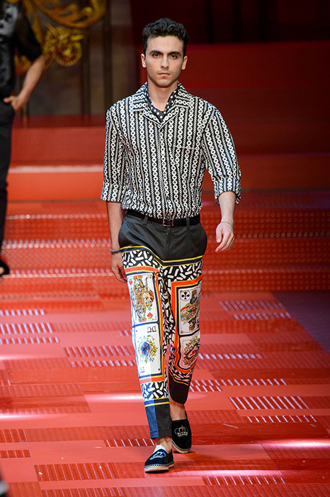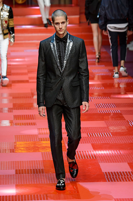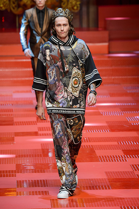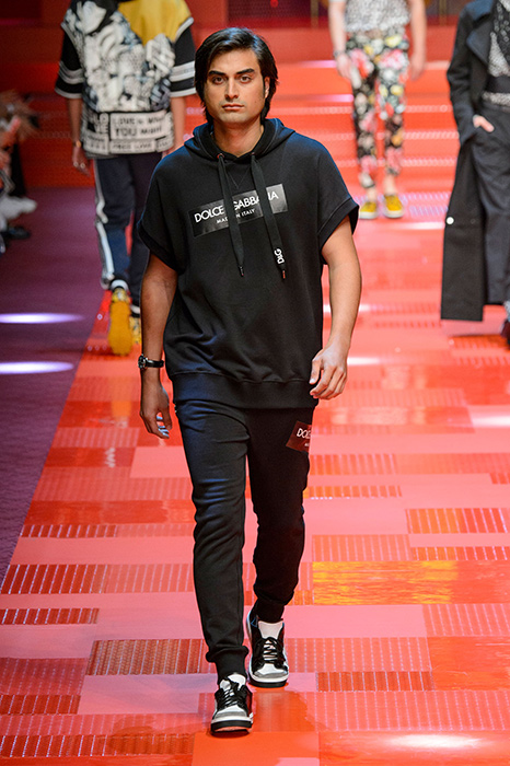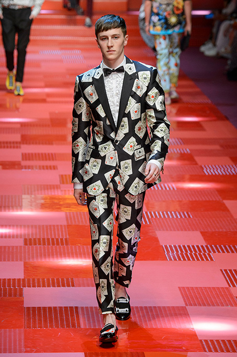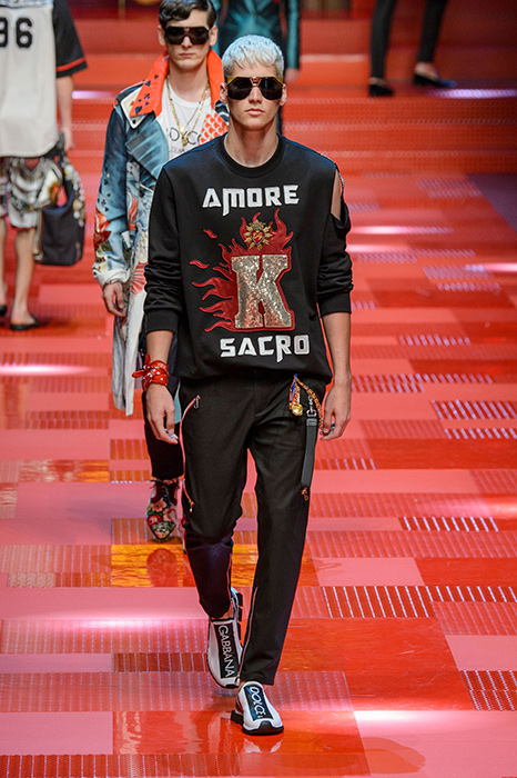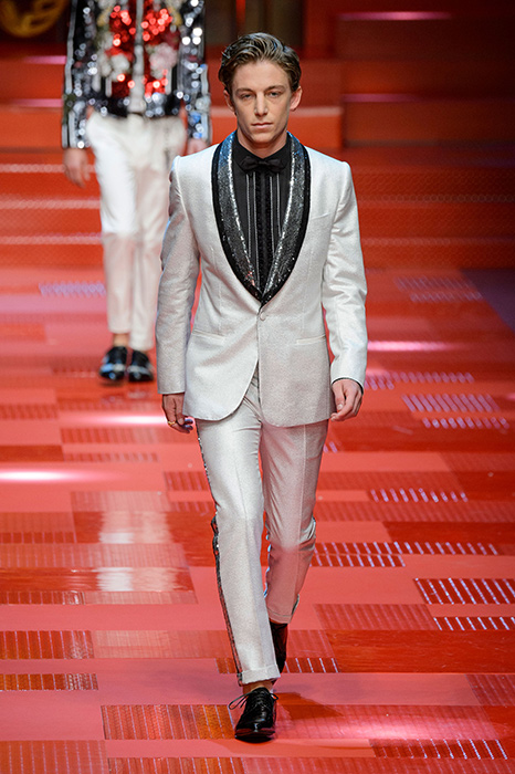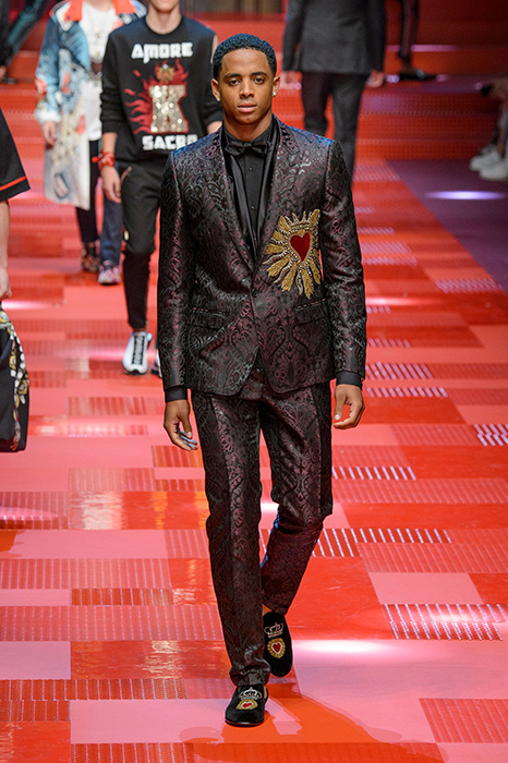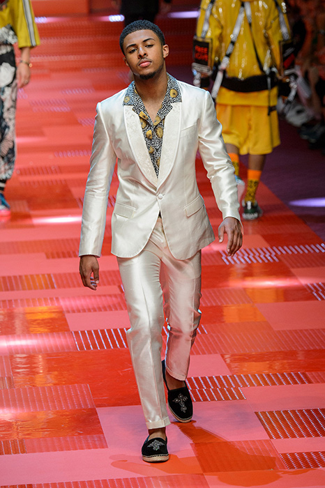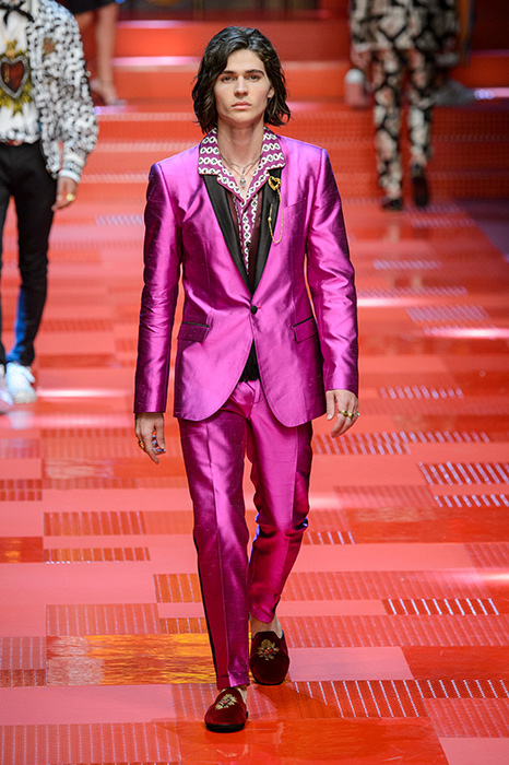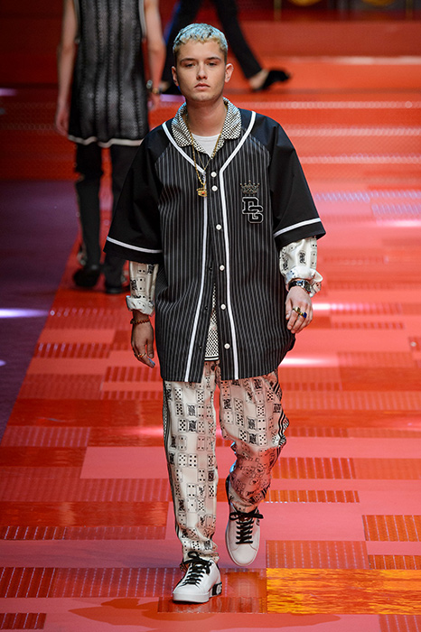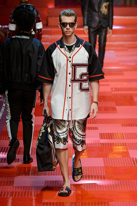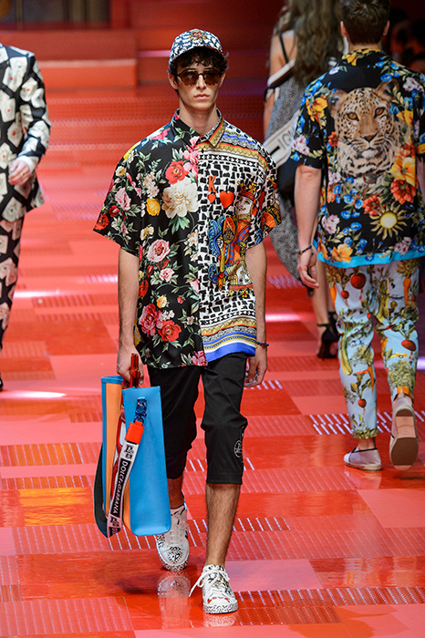 Кастинг прошлого показа женской коллекции сезона осень-зима Dolce & Gabbana в основном состоял из преданных поклонников дизайнерского дуэта: светских львиц, известных инстаграм-блогеров и звездных миллениалов. Бренд продолжил развиваться в сторону молодого покупателя и в качестве моделей для шоу мужской коллекции весна-лето 2018 привлек молодых блогеров и детей знаменитостей: среди них были племянник Билла Клинтона Тайлер, сын Памелы Андерсон и Томми Ли Брэндон, сын Изабеллы Росселини Роберто и многие другие. Что касается самой коллекции, то здесь дизайнеры остаются верными своей любви к эклектике. Так, здесь появились уже знакомые и любимые фанатами бренда яркие принты, громкие надписи и обилие вышивки, а также костюмы из атласа.
