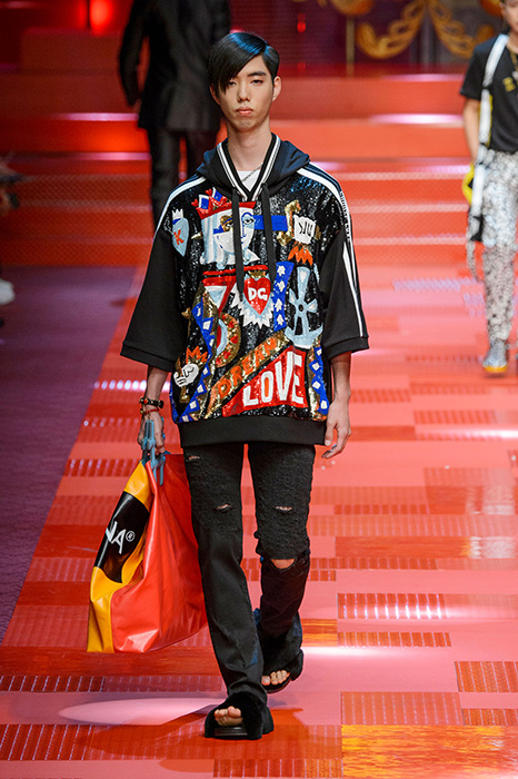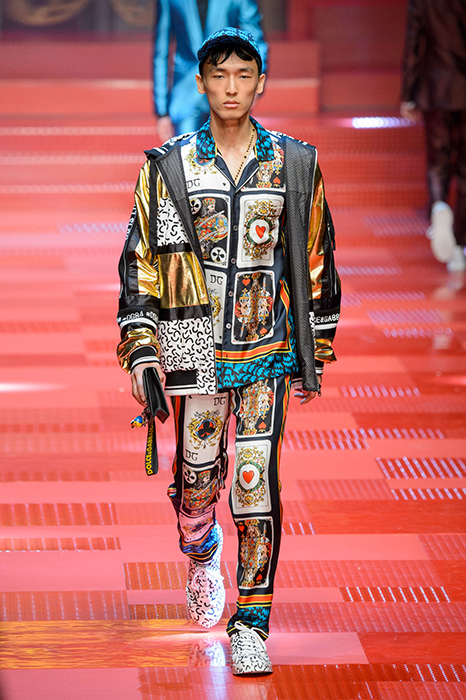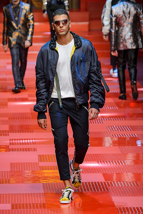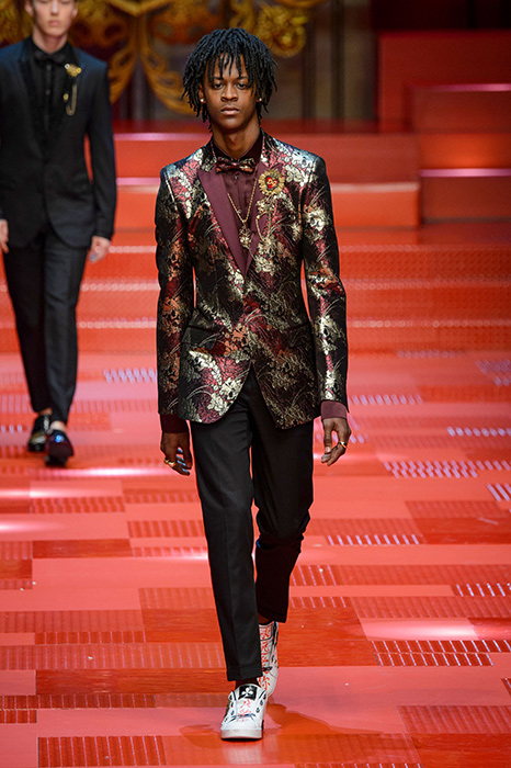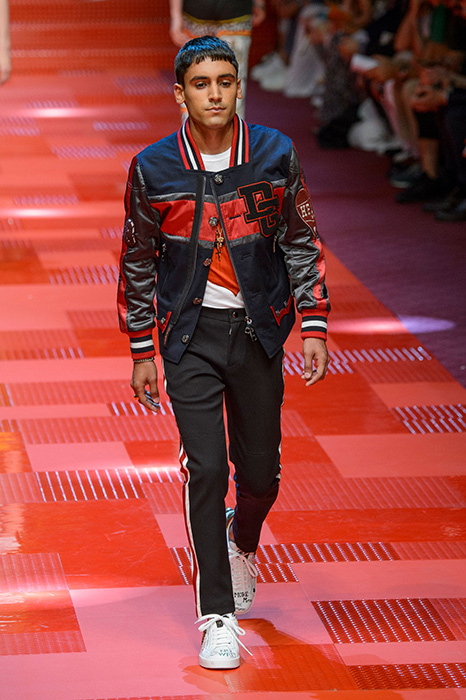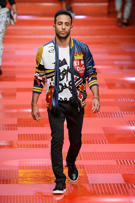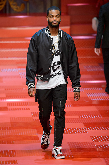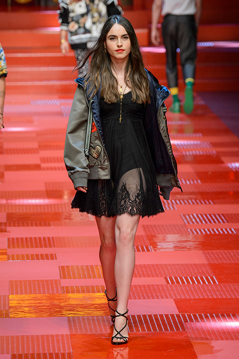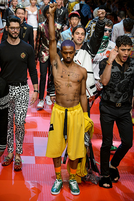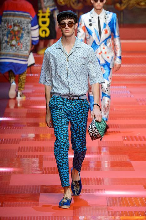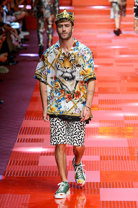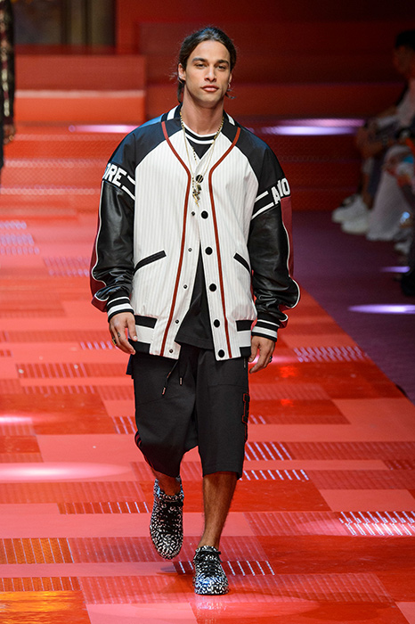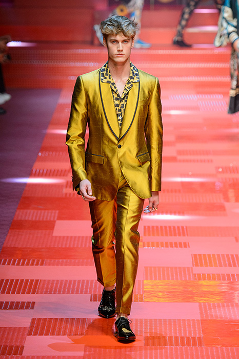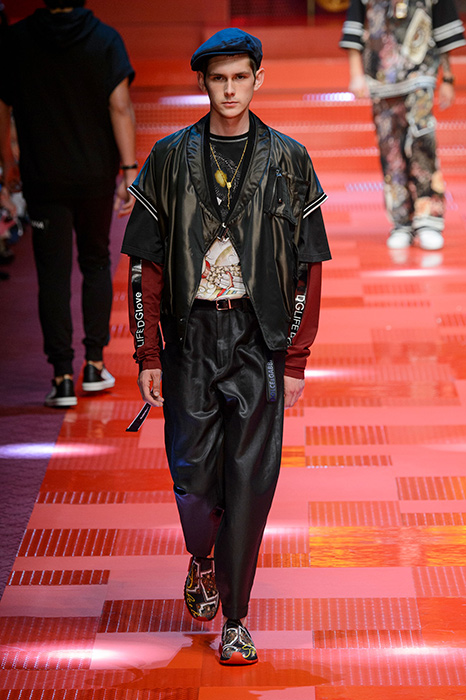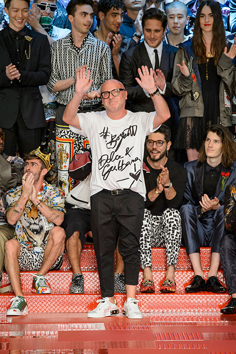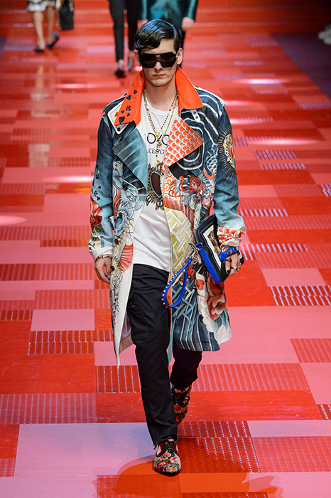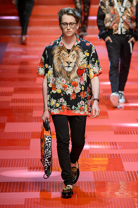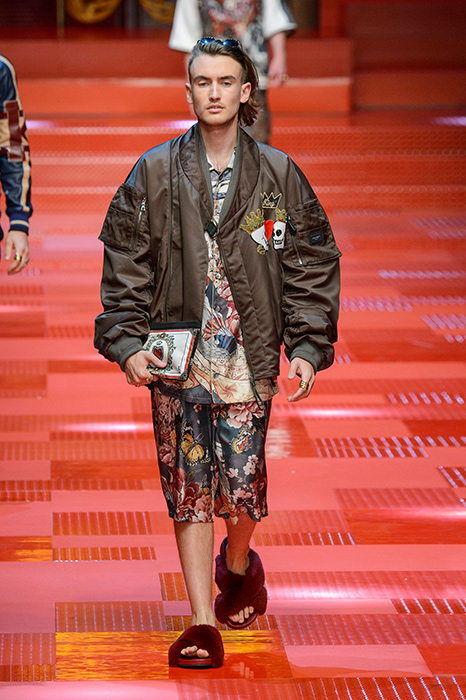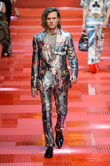 Кастинг прошлого показа женской коллекции сезона осень-зима Dolce & Gabbana в основном состоял из преданных поклонников дизайнерского дуэта: светских львиц, известных инстаграм-блогеров и звездных миллениалов. Бренд продолжил развиваться в сторону молодого покупателя и в качестве моделей для шоу мужской коллекции весна-лето 2018 привлек молодых блогеров и детей знаменитостей: среди них были племянник Билла Клинтона Тайлер, сын Памелы Андерсон и Томми Ли Брэндон, сын Изабеллы Росселини Роберто и многие другие. Что касается самой коллекции, то здесь дизайнеры остаются верными своей любви к эклектике. Так, здесь появились уже знакомые и любимые фанатами бренда яркие принты, громкие надписи и обилие вышивки, а также костюмы из атласа.