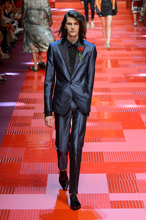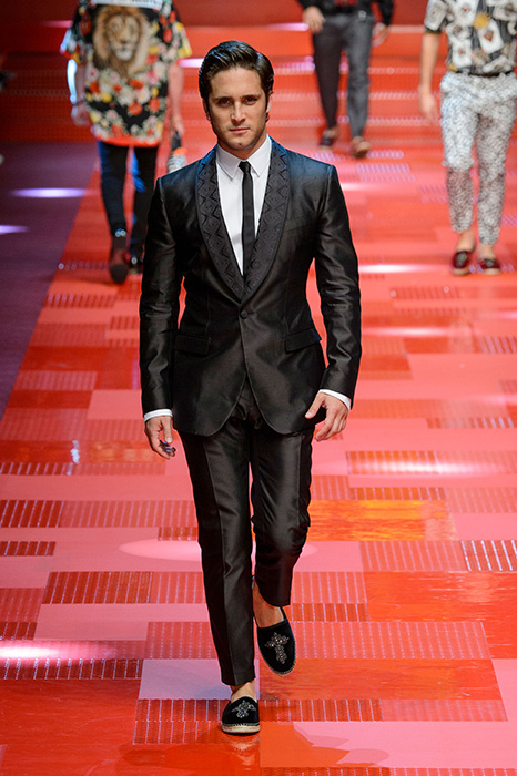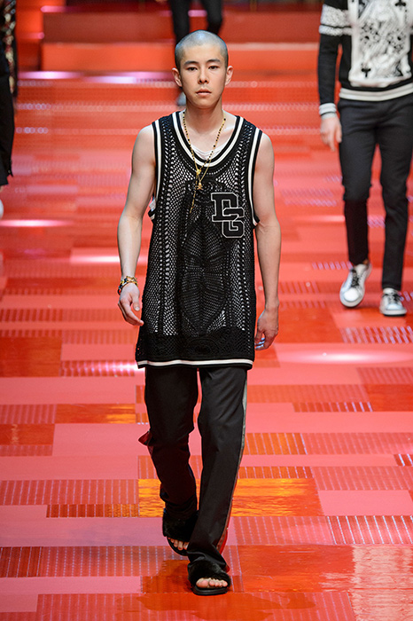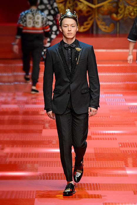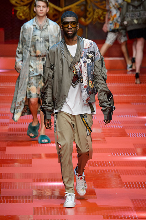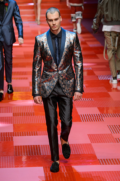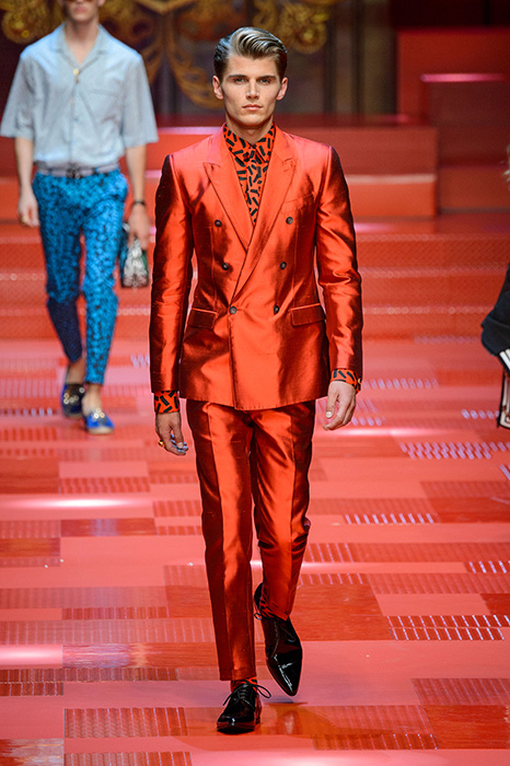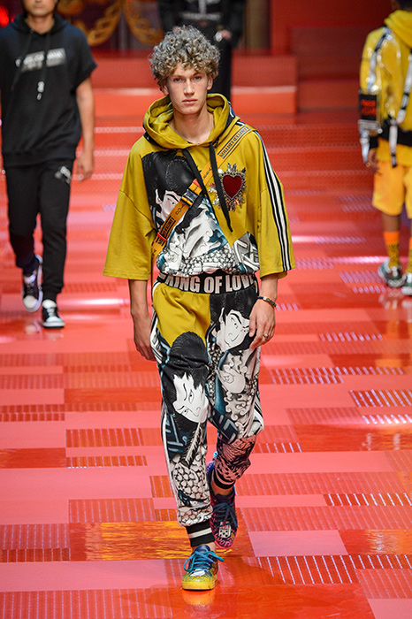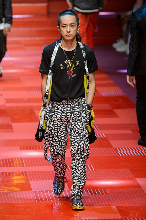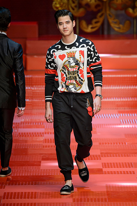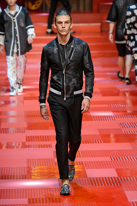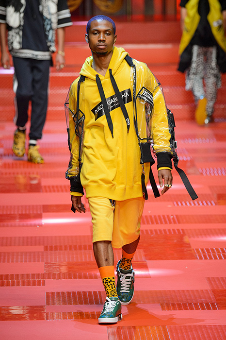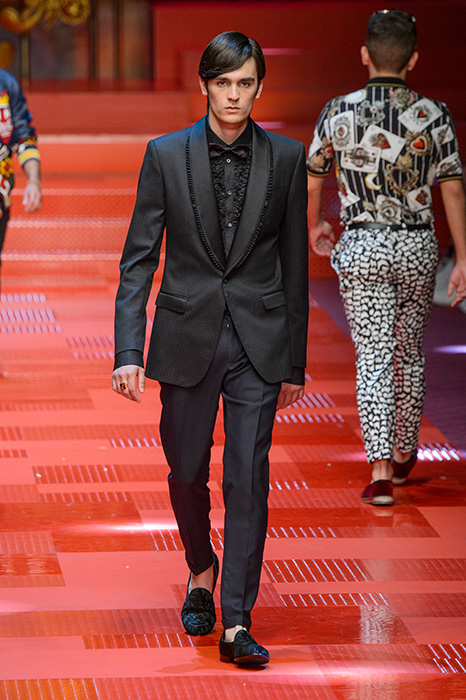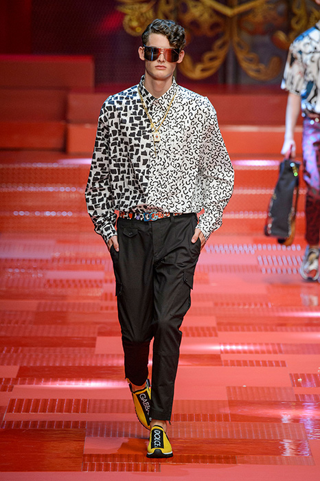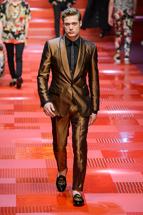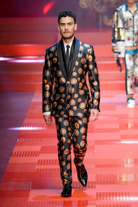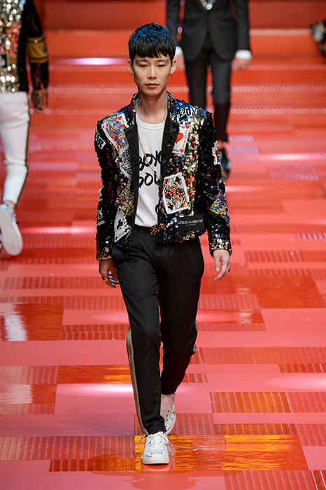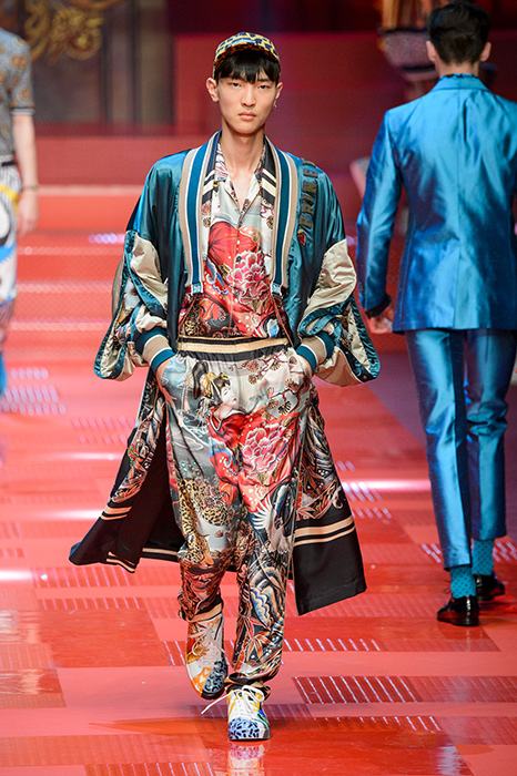 Кастинг прошлого показа женской коллекции сезона осень-зима Dolce & Gabbana в основном состоял из преданных поклонников дизайнерского дуэта: светских львиц, известных инстаграм-блогеров и звездных миллениалов. Бренд продолжил развиваться в сторону молодого покупателя и в качестве моделей для шоу мужской коллекции весна-лето 2018 привлек молодых блогеров и детей знаменитостей: среди них были племянник Билла Клинтона Тайлер, сын Памелы Андерсон и Томми Ли Брэндон, сын Изабеллы Росселини Роберто и многие другие. Что касается самой коллекции, то здесь дизайнеры остаются верными своей любви к эклектике. Так, здесь появились уже знакомые и любимые фанатами бренда яркие принты, громкие надписи и обилие вышивки, а также костюмы из атласа.
