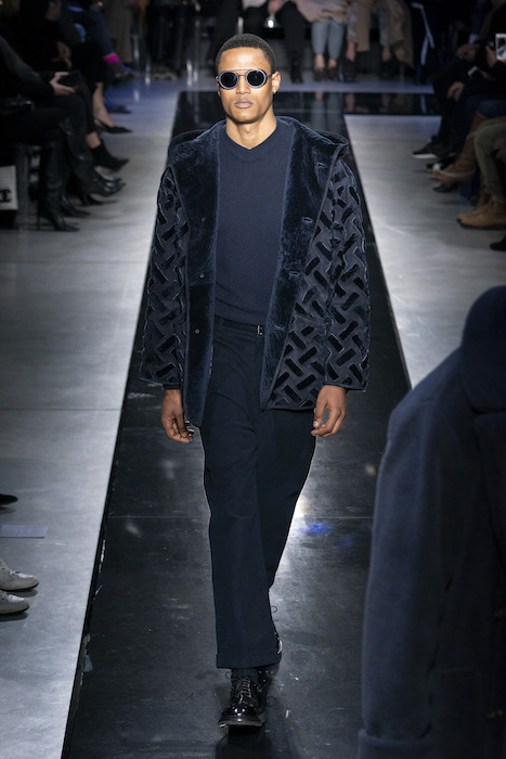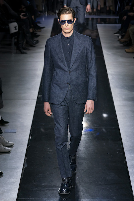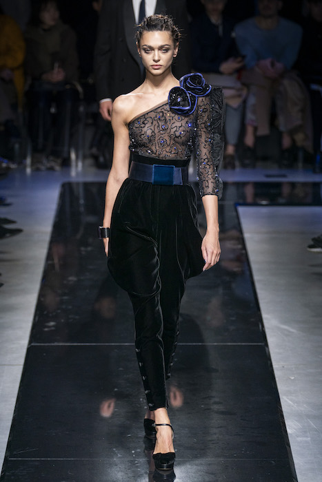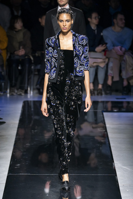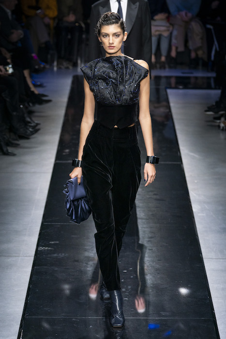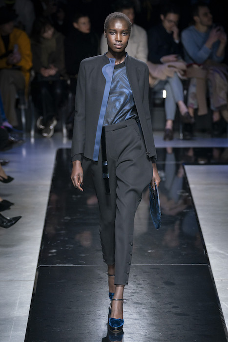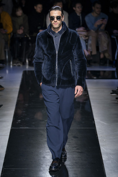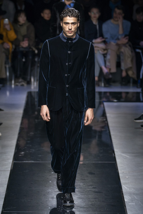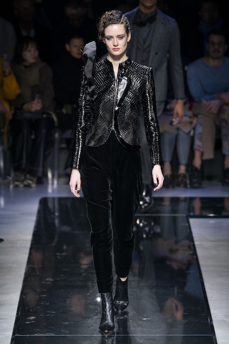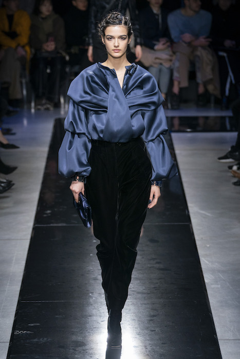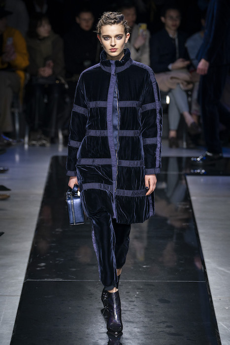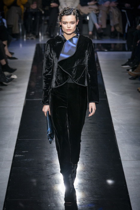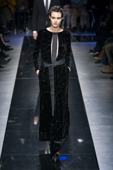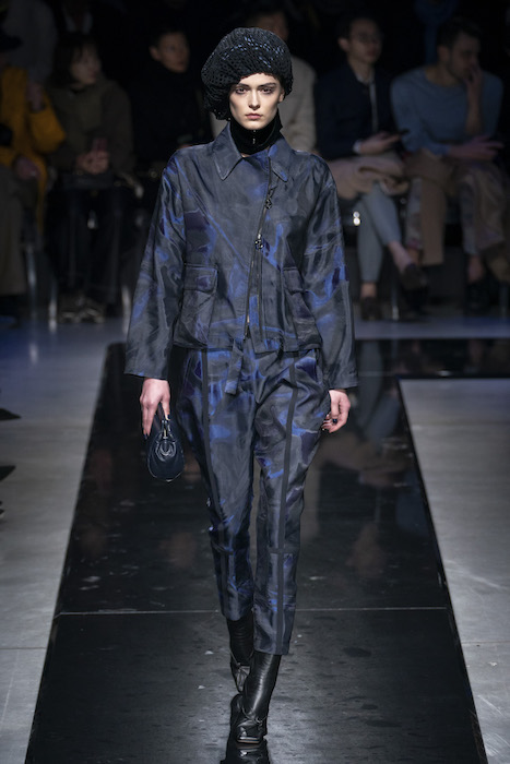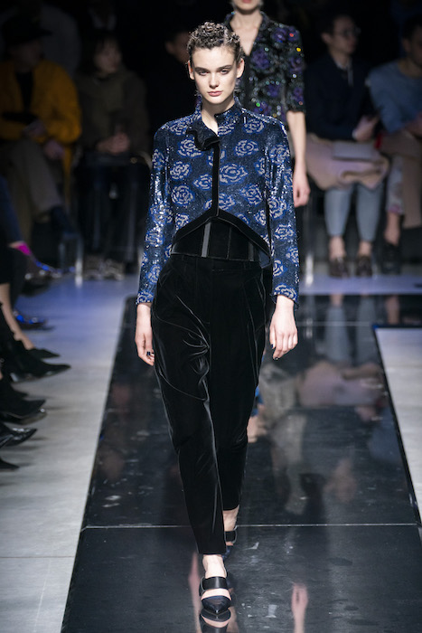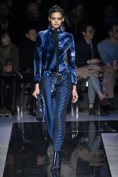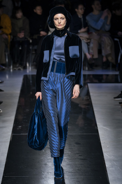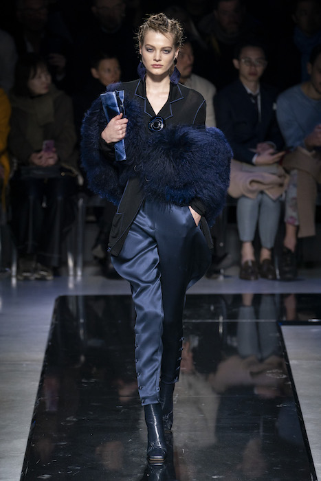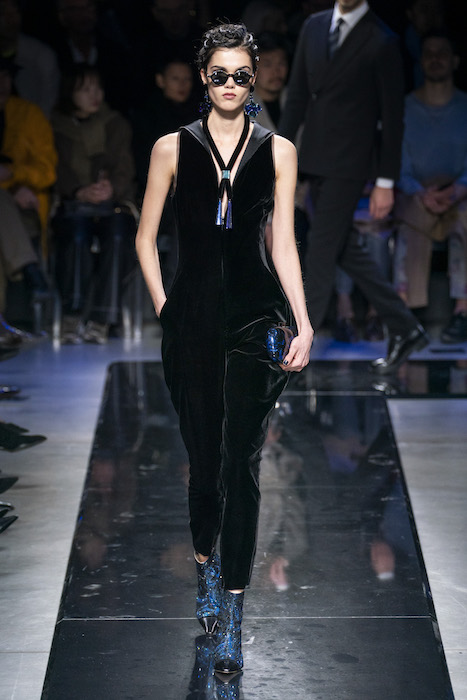 Новая коллекция Armani — впервые мужская и женская одновременно — получила название «Rhapsody in Blue». Практически все образы были сделаны в оттенках синего: лазурно-синие приталенные костюмы, сапфировые меховые накидки, атласные комбинезоны джинсового оттенка и много бархатных комплектов. Даже сам Джорджо Армани вышел на поклон в конце шоу в синем.