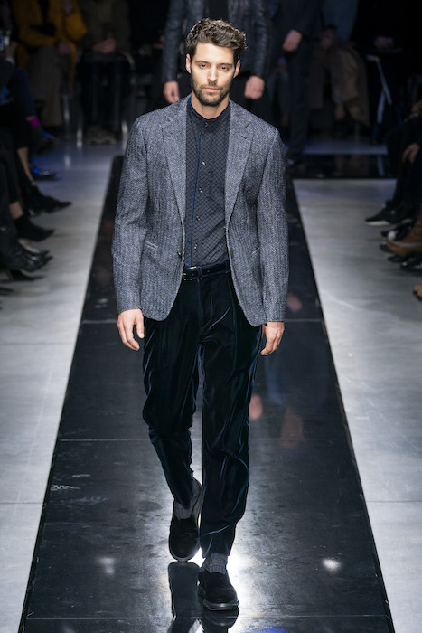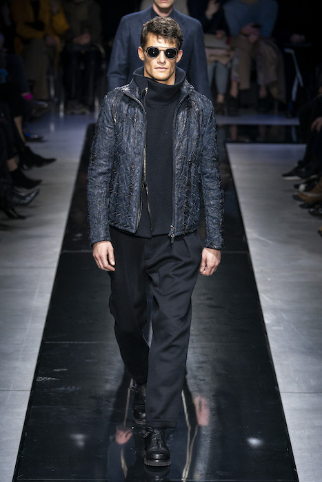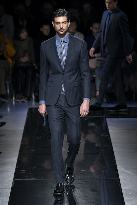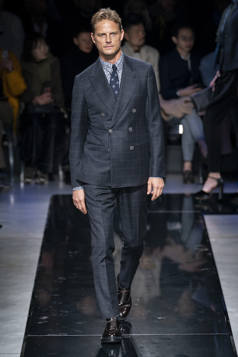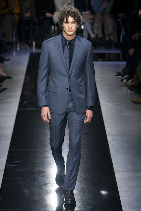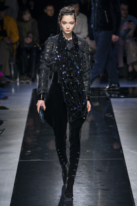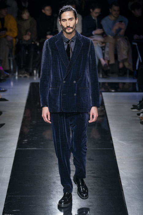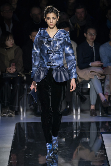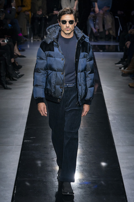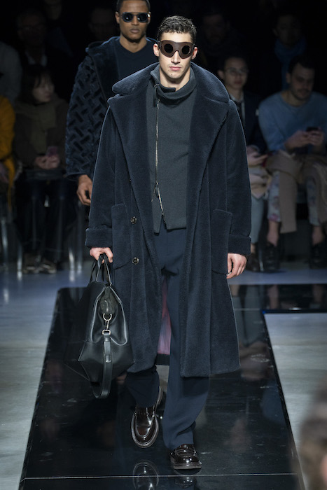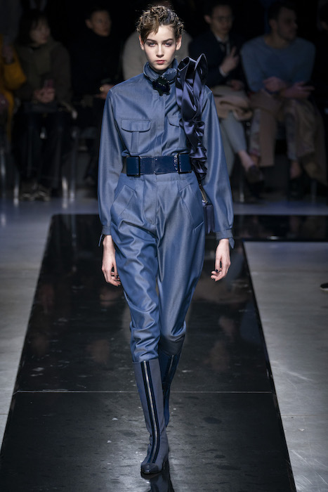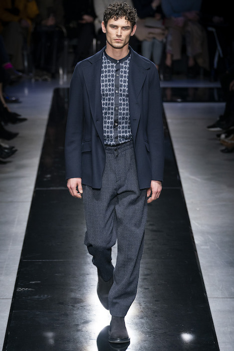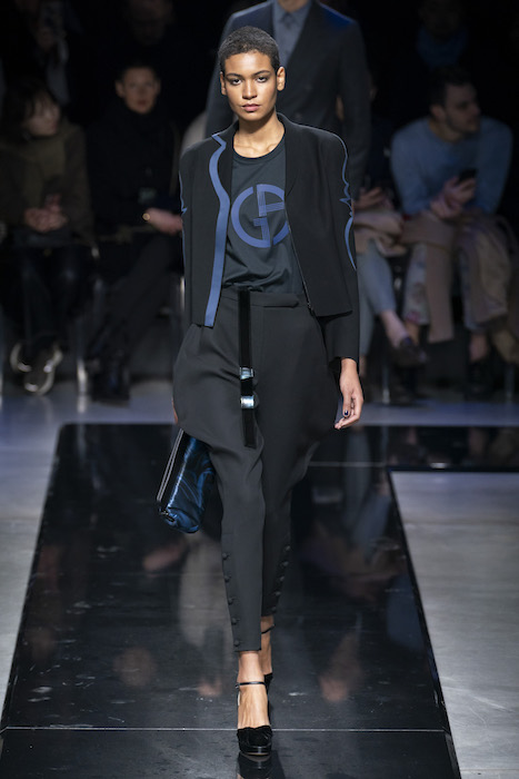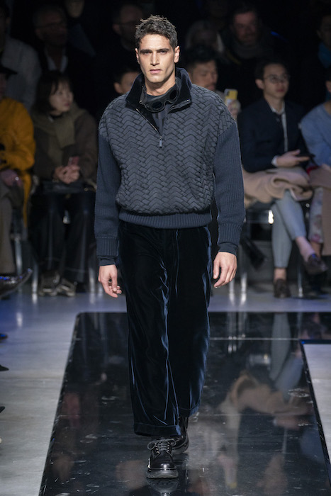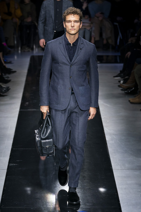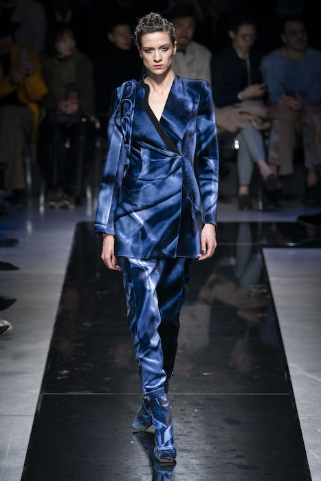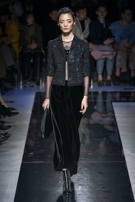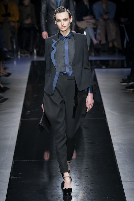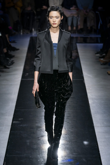 Новая коллекция Armani — впервые мужская и женская одновременно — получила название «Rhapsody in Blue». Практически все образы были сделаны в оттенках синего: лазурно-синие приталенные костюмы, сапфировые меховые накидки, атласные комбинезоны джинсового оттенка и много бархатных комплектов. Даже сам Джорджо Армани вышел на поклон в конце шоу в синем.
