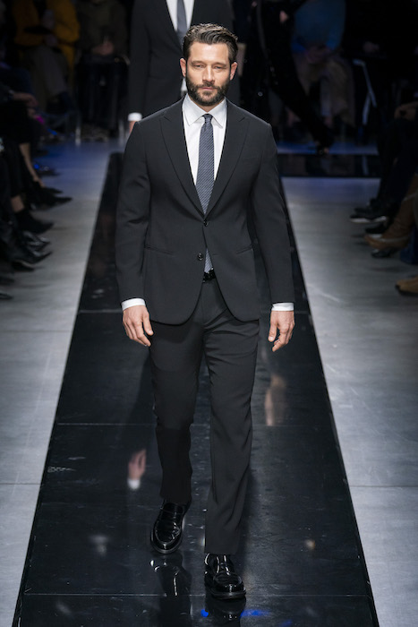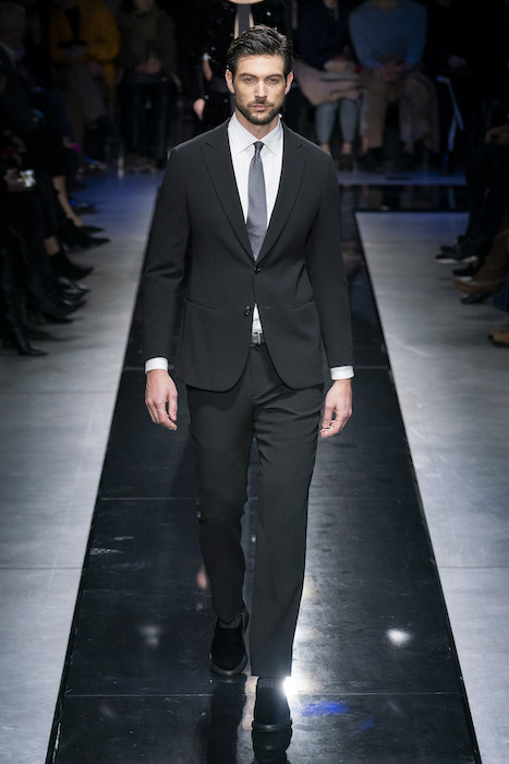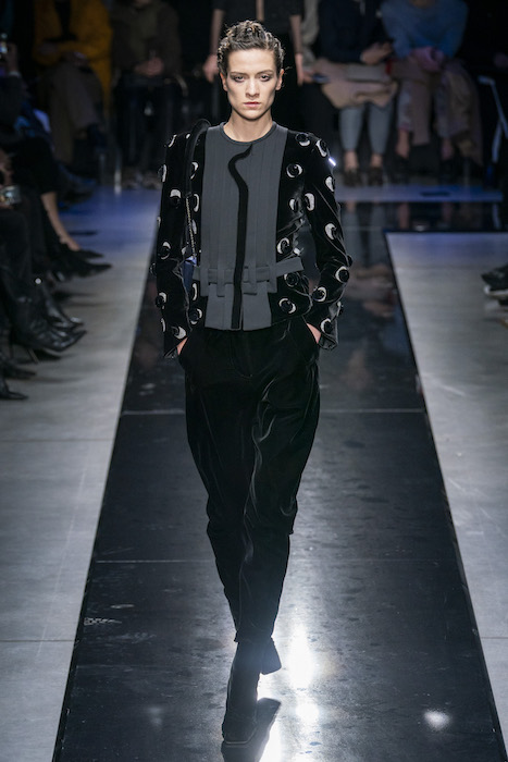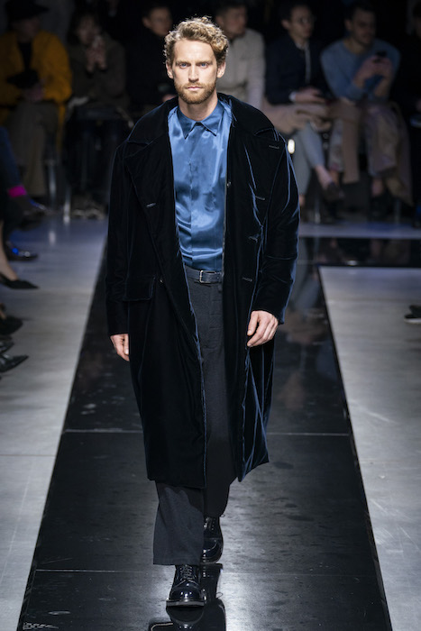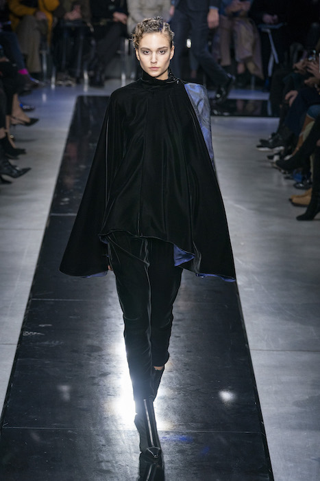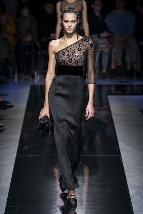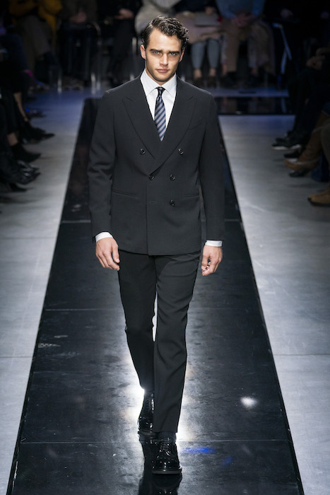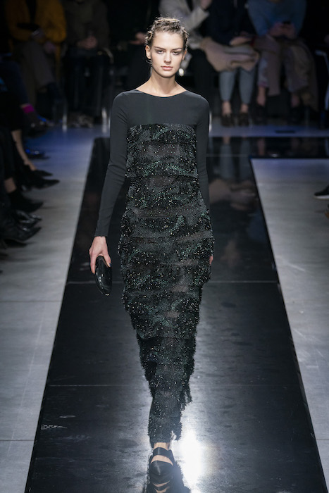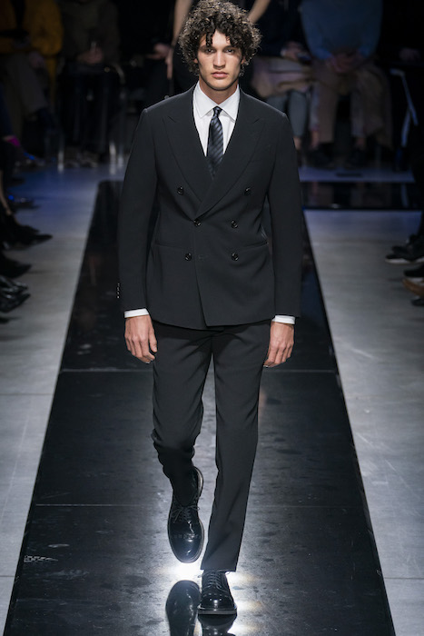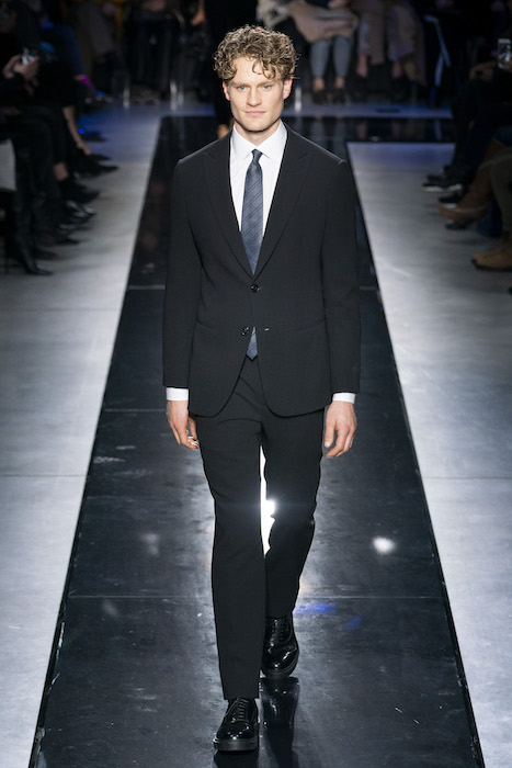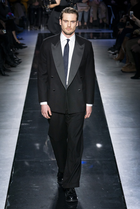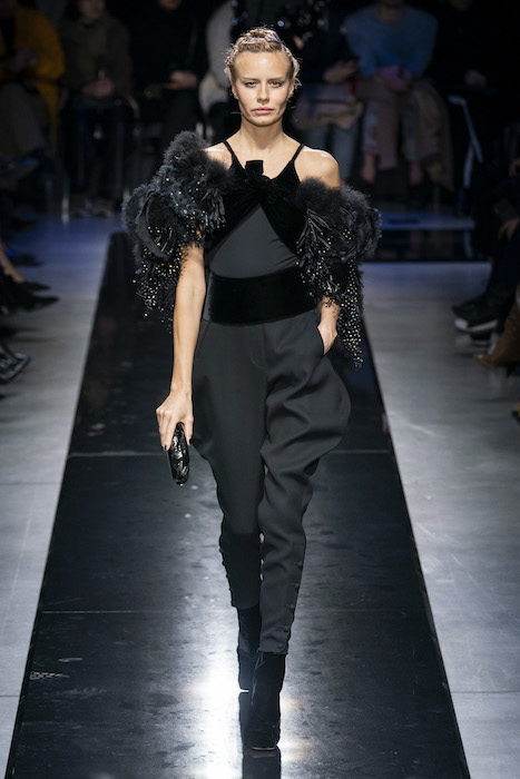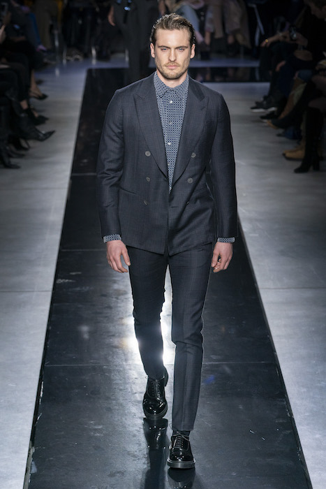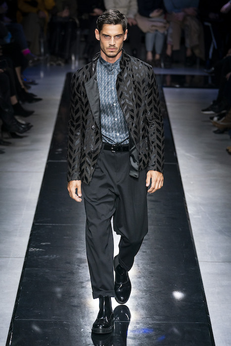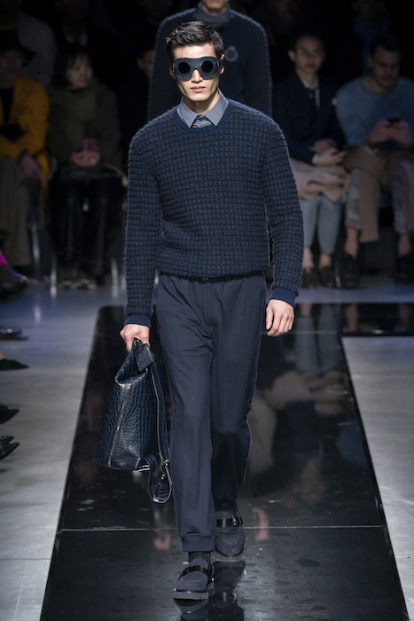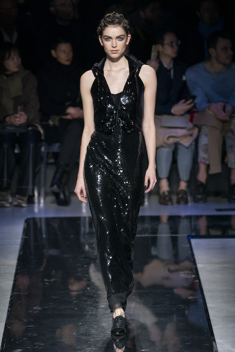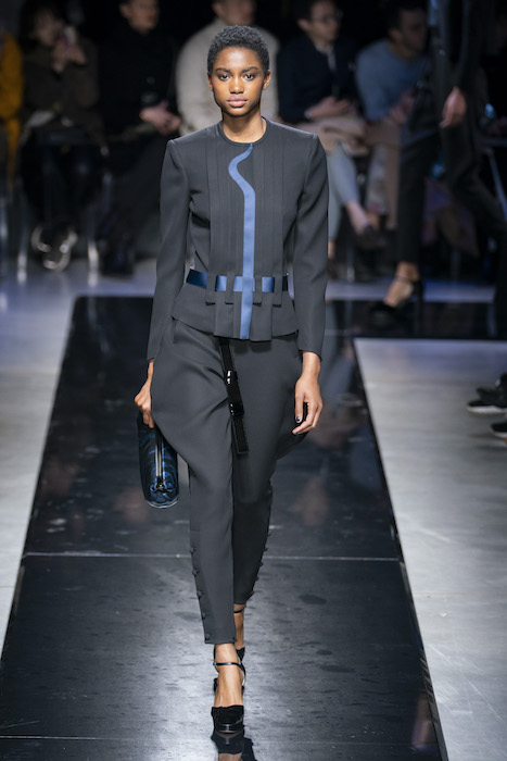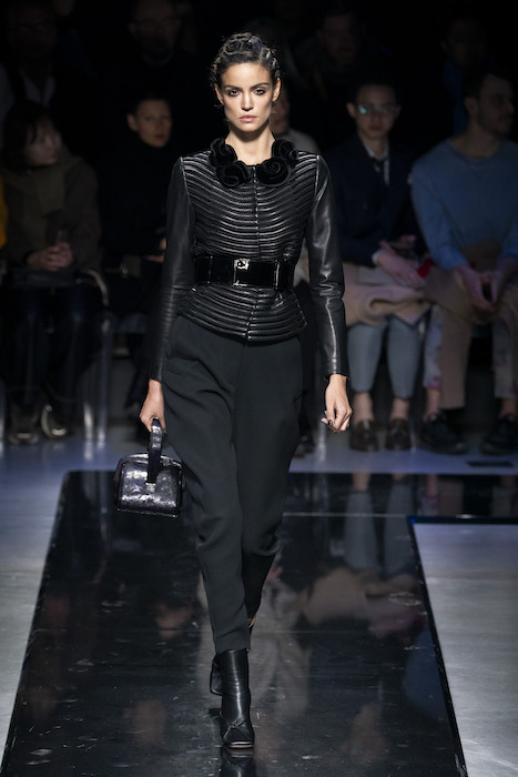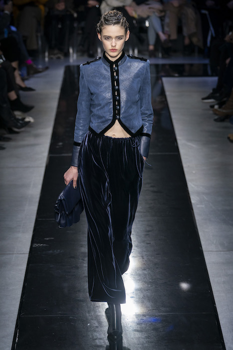 Новая коллекция Armani — впервые мужская и женская одновременно — получила название «Rhapsody in Blue». Практически все образы были сделаны в оттенках синего: лазурно-синие приталенные костюмы, сапфировые меховые накидки, атласные комбинезоны джинсового оттенка и много бархатных комплектов. Даже сам Джорджо Армани вышел на поклон в конце шоу в синем.