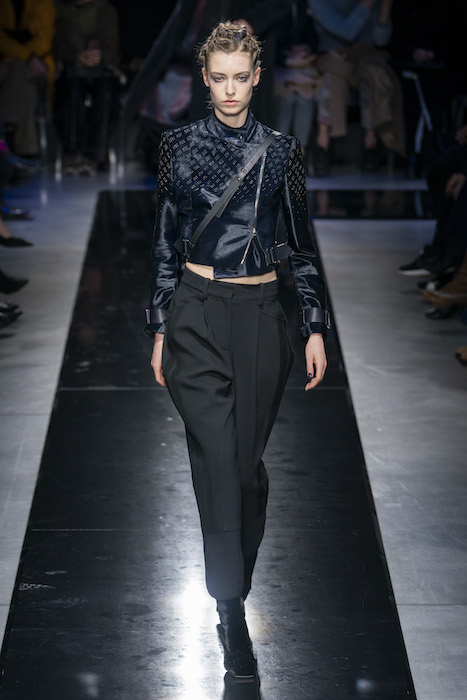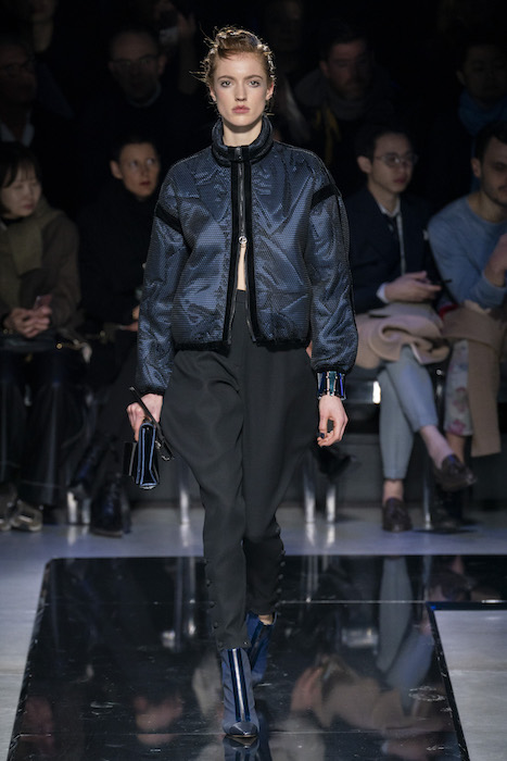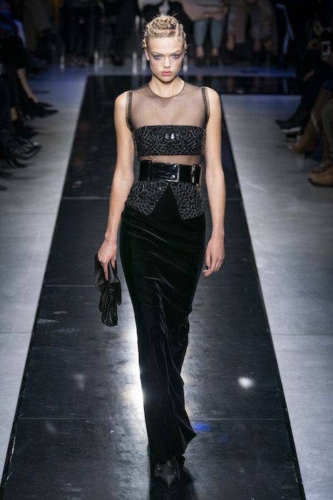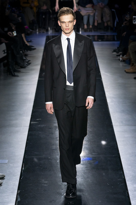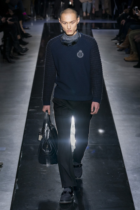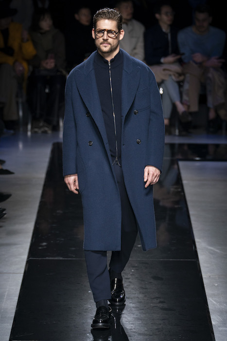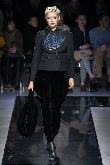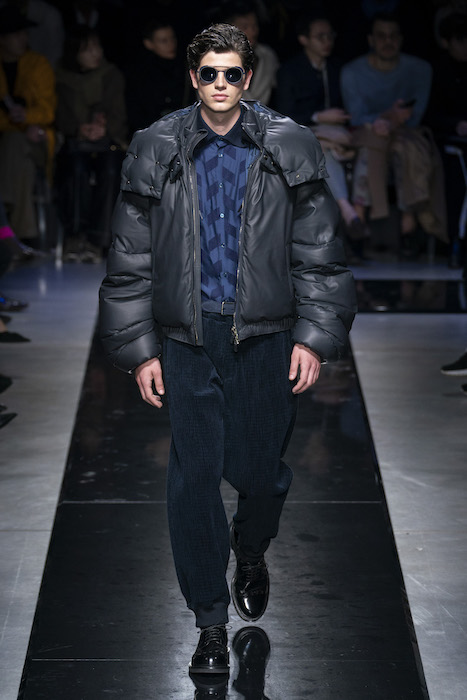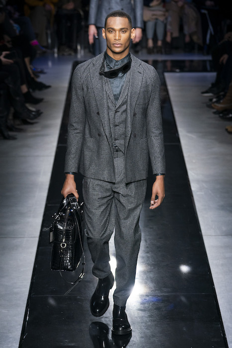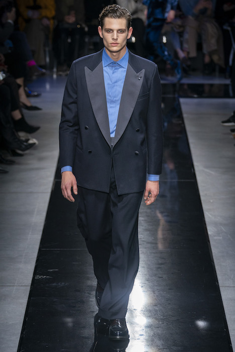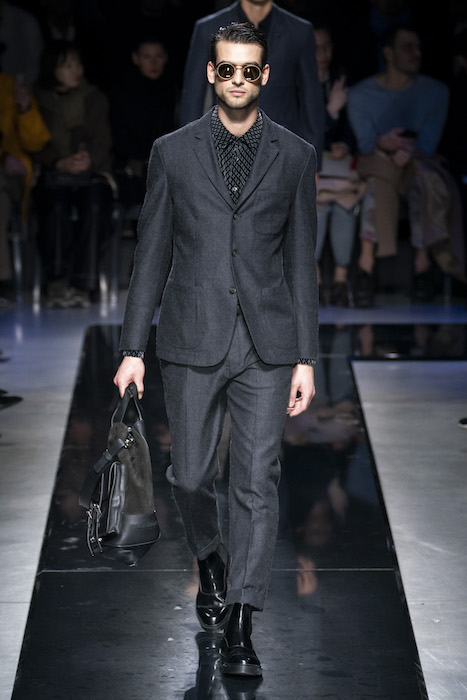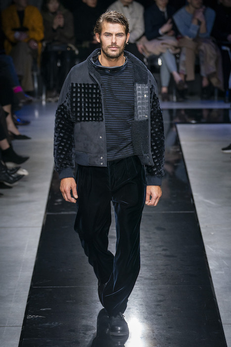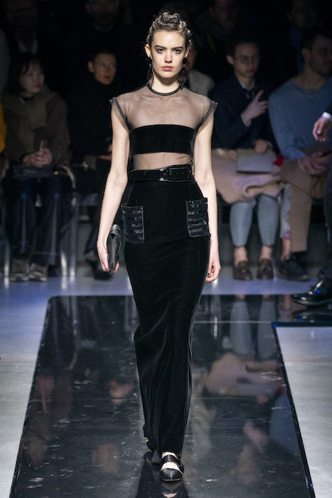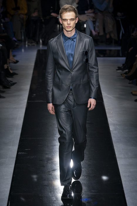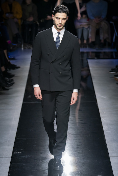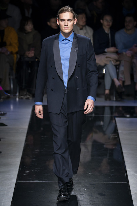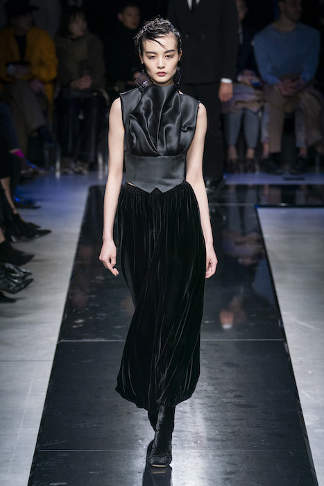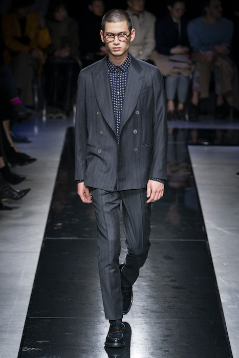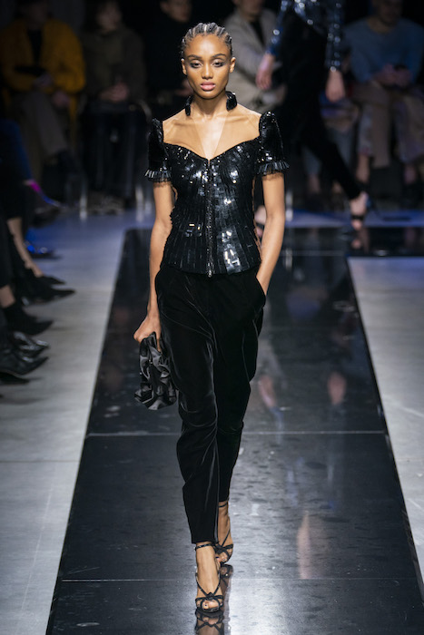 Новая коллекция Armani — впервые мужская и женская одновременно — получила название «Rhapsody in Blue». Практически все образы были сделаны в оттенках синего: лазурно-синие приталенные костюмы, сапфировые меховые накидки, атласные комбинезоны джинсового оттенка и много бархатных комплектов. Даже сам Джорджо Армани вышел на поклон в конце шоу в синем.