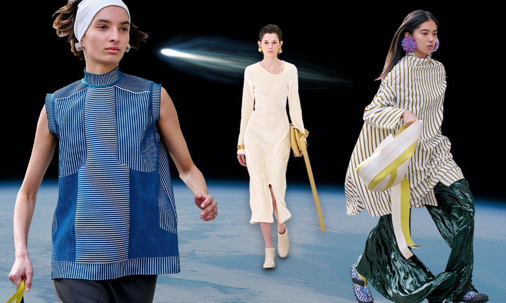 Основа коллекции — шерстяной костюм с короткой юбкой. У жакетов Jil Sander новый силуэт: одни акцентируют талию, увеличивая бедра, а другие, которые без рукавов, сделаны как накидка. Плоские банты на платьях навеяны минималистичными коллекциями Пьера Кардена в 1960-х. В остальном Люси и Люк Мейер верны себе: их Jil Sander — это мягкие линии, спокойные цвета и рукодельные техники (макси-платья из гипюрового кружева и бисерные шапочки в духе 1920-х годов).